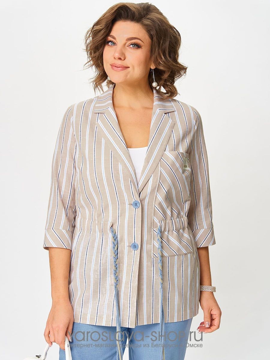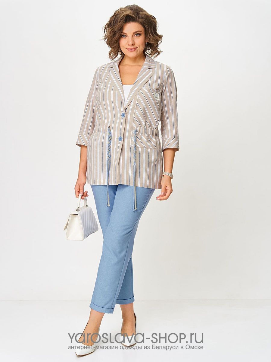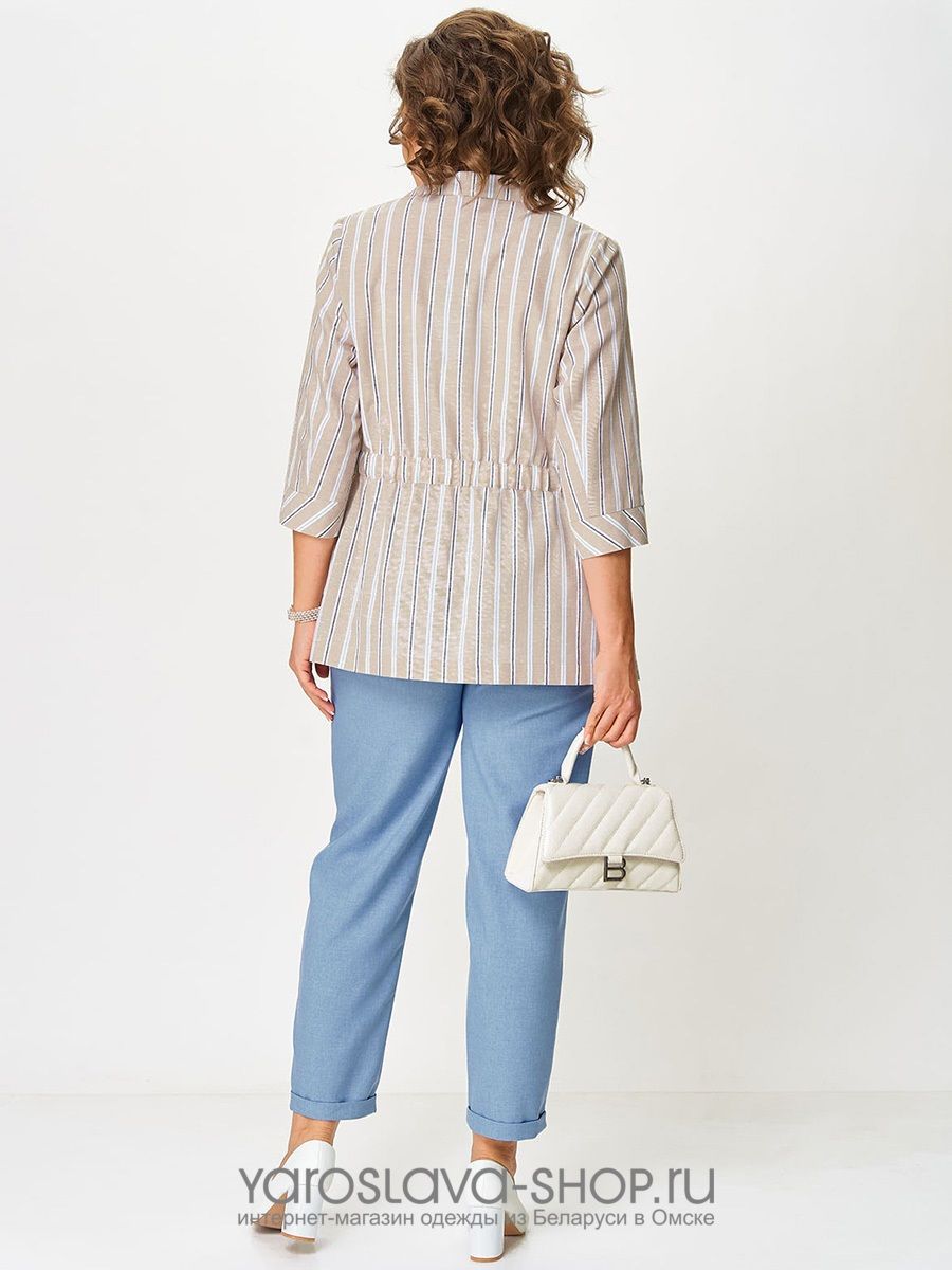Брючный комплект: бежевая блуза в полоску, голубые брюки (модификация 3)