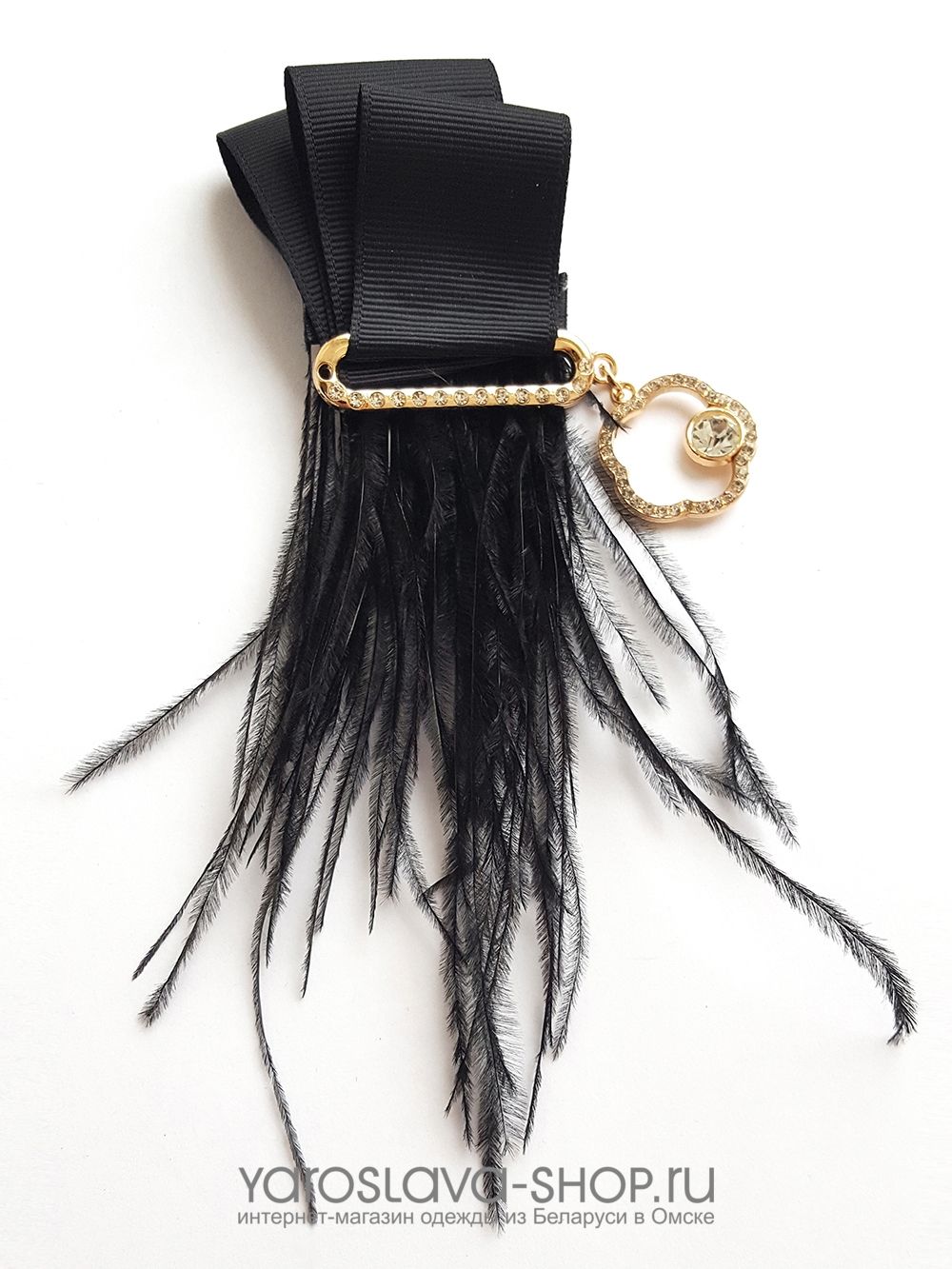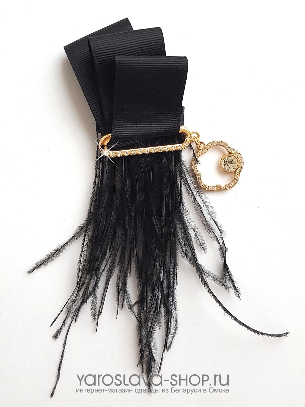 Необычная женственная брошь в виде атласной черной ленты и лаконичных перьев, дополнена подвеской со стразами.