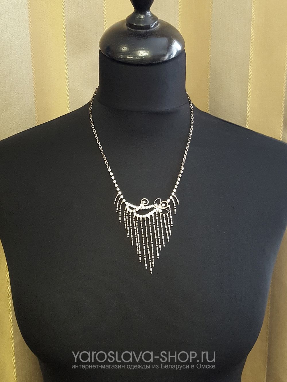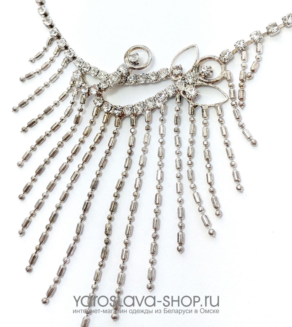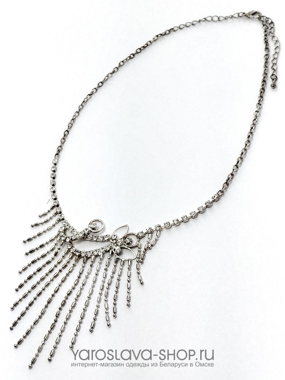 Колье из серебристого металла с прозрачными стразами и застежкой карабин.
