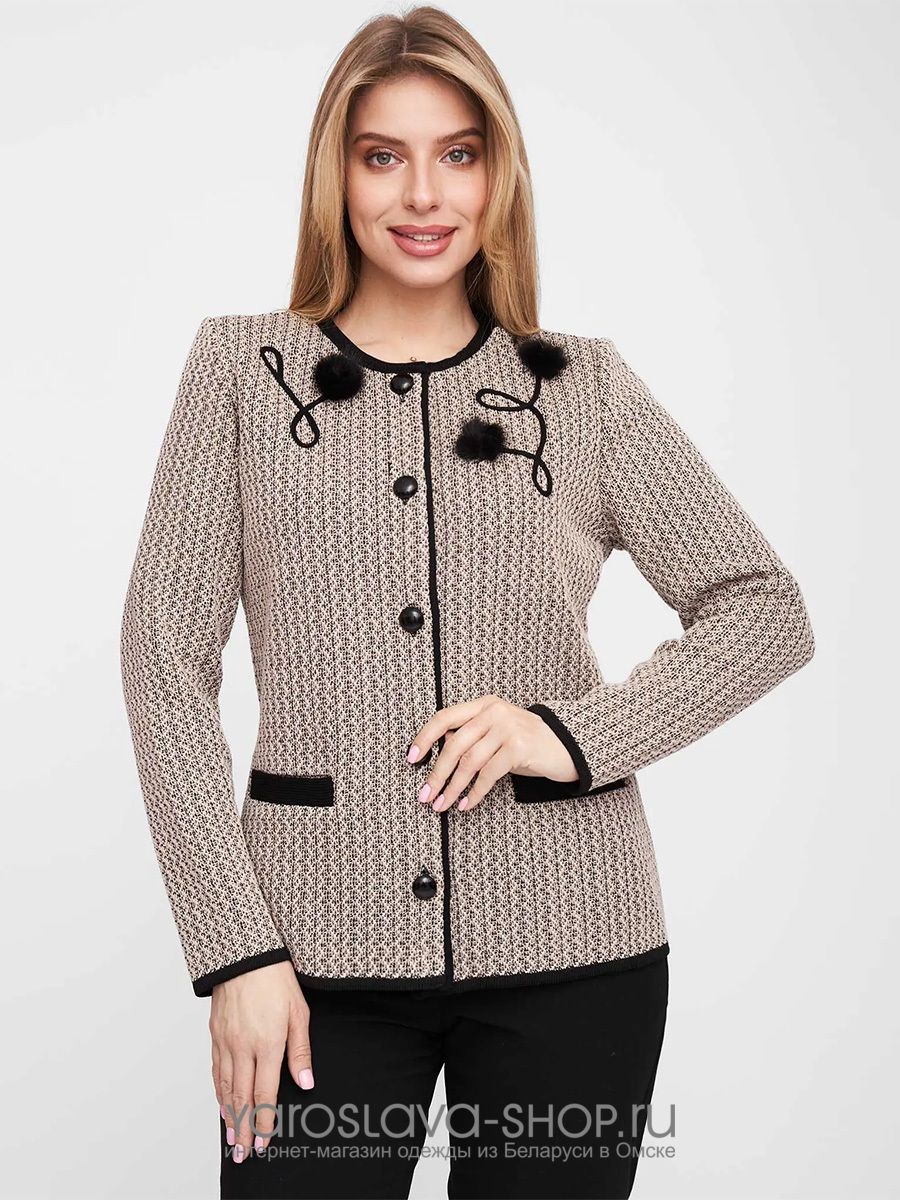 Жакет женский полуприлегающего силуэта с круглой горловиной. Жакет застегивается на пуговицы контрастного цвета. Рукава втачные длинные. Два прорезных кармана. Вязанный жакет выполнен жаккардовым переплетением. Горловина, низ рукавов, низ изделия и вход в карманы выполнены контрастным цветом. По верху полочек выложен рисунок трикотажным шнурком и мехом.