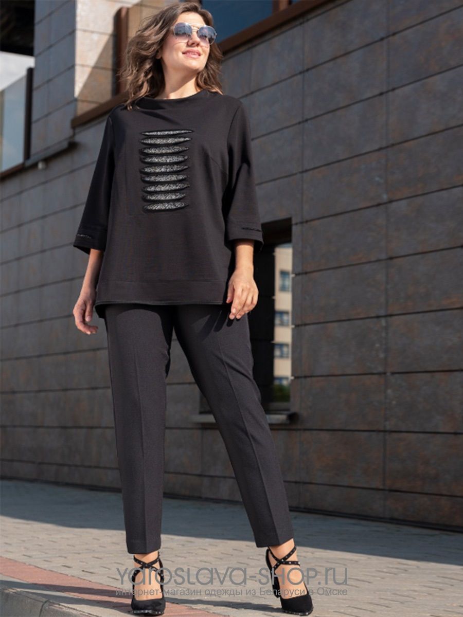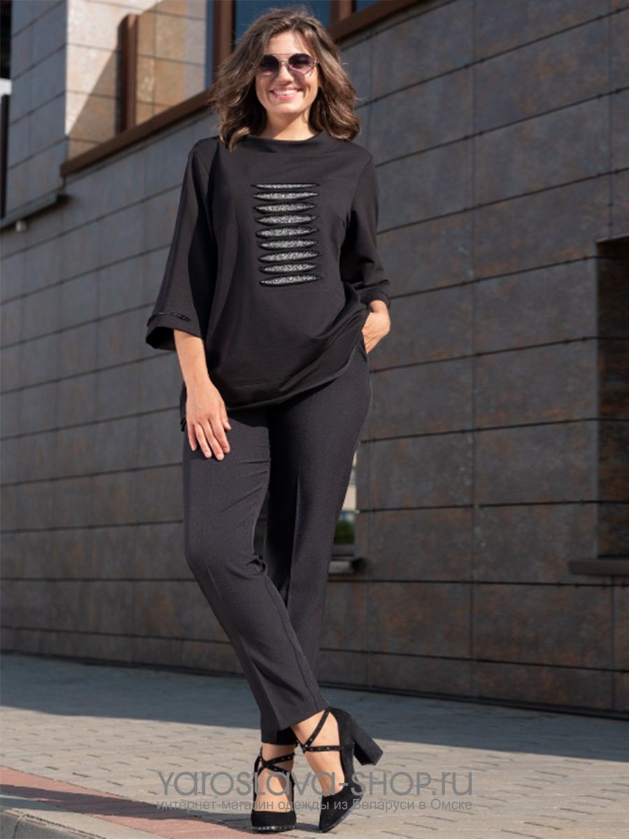 Комплект женский: черный трикотажный джемпер и брюки черного цвета. Удобный демисезонный комплект двойка. Брюки с застежкой на молнию. Пояс втачной, на резинке. В боковых швах выполнены удобные карманы. Джемпер свободного кроя, с округлым вырезом горловины, рукавами 3/4. По переду джемпера оригинальное украшение -вставка светлого оттенка.