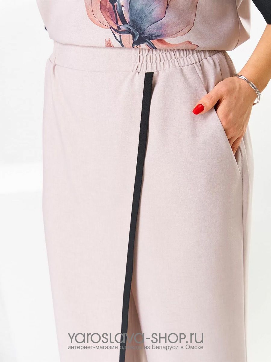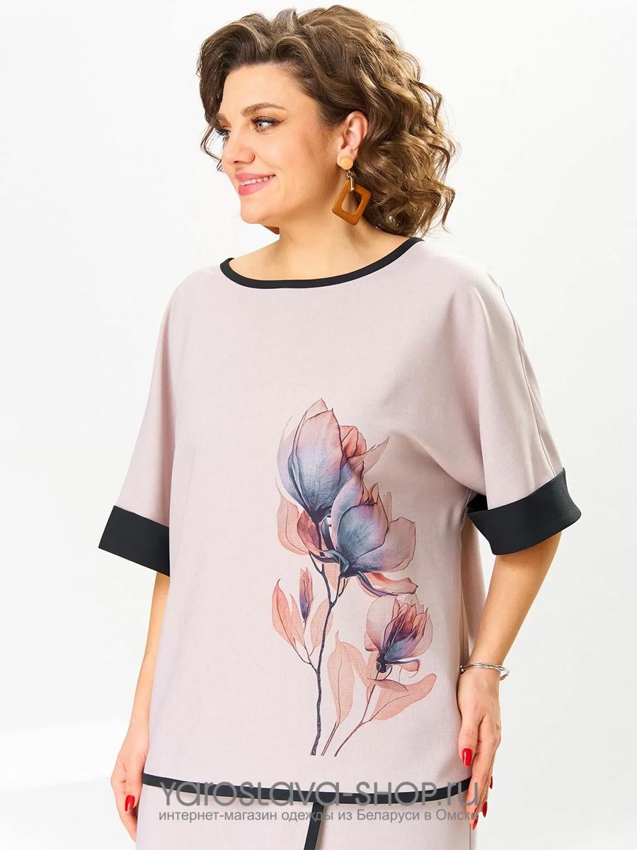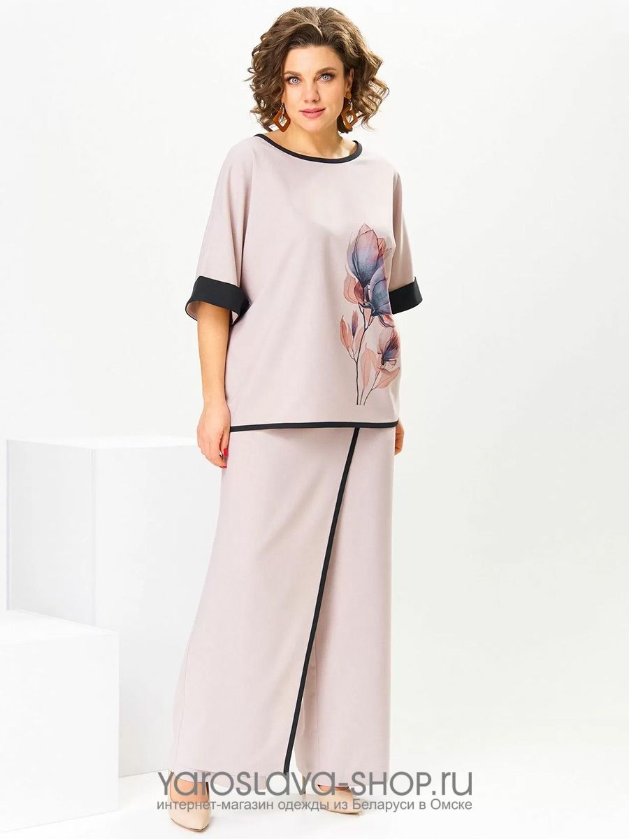 Костюм женский предназначен для повседневной носки. Костюм женский, 2-х предметный блузон и брюки. Блузон женский прямого силуэта, длиной до линии бёдер. Перед цельнокроеный, декорирован принтом. Спинка цельнокроеная. Горловина круглая, с притачным отделочным кантом. Рукав цельнокроеный, длиной до локтя, с притачной отложной манжетой из отделочной ткани. Низ блузона с притачным отделочным кантом. Блузон без плечевых накладок. Брюки женские, прямые, длинные. Передние половинки с карманами в боковых швах с отрезными бочками. Задние половинки с таллиевыми вытачками. Брюки с отлетной ассиметричной деталью, закреплённой в правом боковом шве, с отделочным притачным кантом. Брюки с притачным поясом, частично собранным на эластичную тесьму, закреплённую 2-мя отделочными строчками.