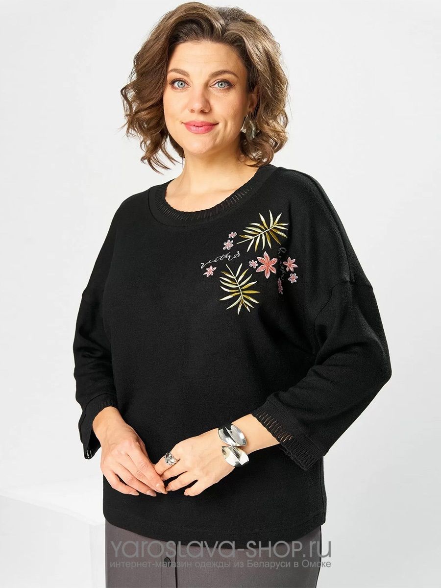 Костюм женский двух предметный: джемпер и юбка предназначен для повседневной носки. Джемпер прямого силуэта, длиной до линии бедер. Перед цельнокроеный, декорирован худ. Вышивкой. Спинка цельнокроеная. Горловина круглая, с втачной фигурной планкой из отделочной ткани. Джемпер со спущенной проймой. Рукав втачной, одно шовный, длиной 7/8. Юбка прямая, длиной ниже колена. Переднее полотнище с двумя боковыми фигурными карманами. Заднее полотнище с двумя таллиевыми вытачками. Застежка спереди на 8 металлических кнопок. Верхний срез с притачным поясом, с 4 надстрочными шлевками, между карманами и вытачками заднего полотнища пояс собран на эластичную тесьму. Юбка на подкладке.