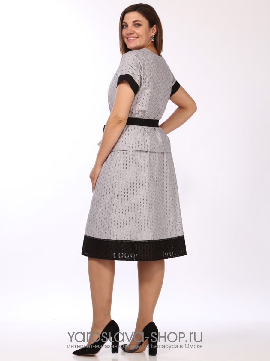 Костюм женский летний нарядный юбочный. Костюм женский 2-х предметный, состоящий из блузы и юбки выполнен из шитья. Блуза женская с круглым вырезом горловины. Рукава цельнокроеные короткие по нижнему срезу обработаны трикотажным довязом. Юбка посажена на хлопчатобумажный подклад. Скроена юбка из 4-х клиньев с отделочной деталью по низу. Верхний срез с притачным поясом, собранным на широкую эластичную тесьму. По среднему шву юбки переда и отделочной детали настрочена декоративная тесьма. Костюм комплектуется съемным поясом-тесьмой с декоративными элементами.