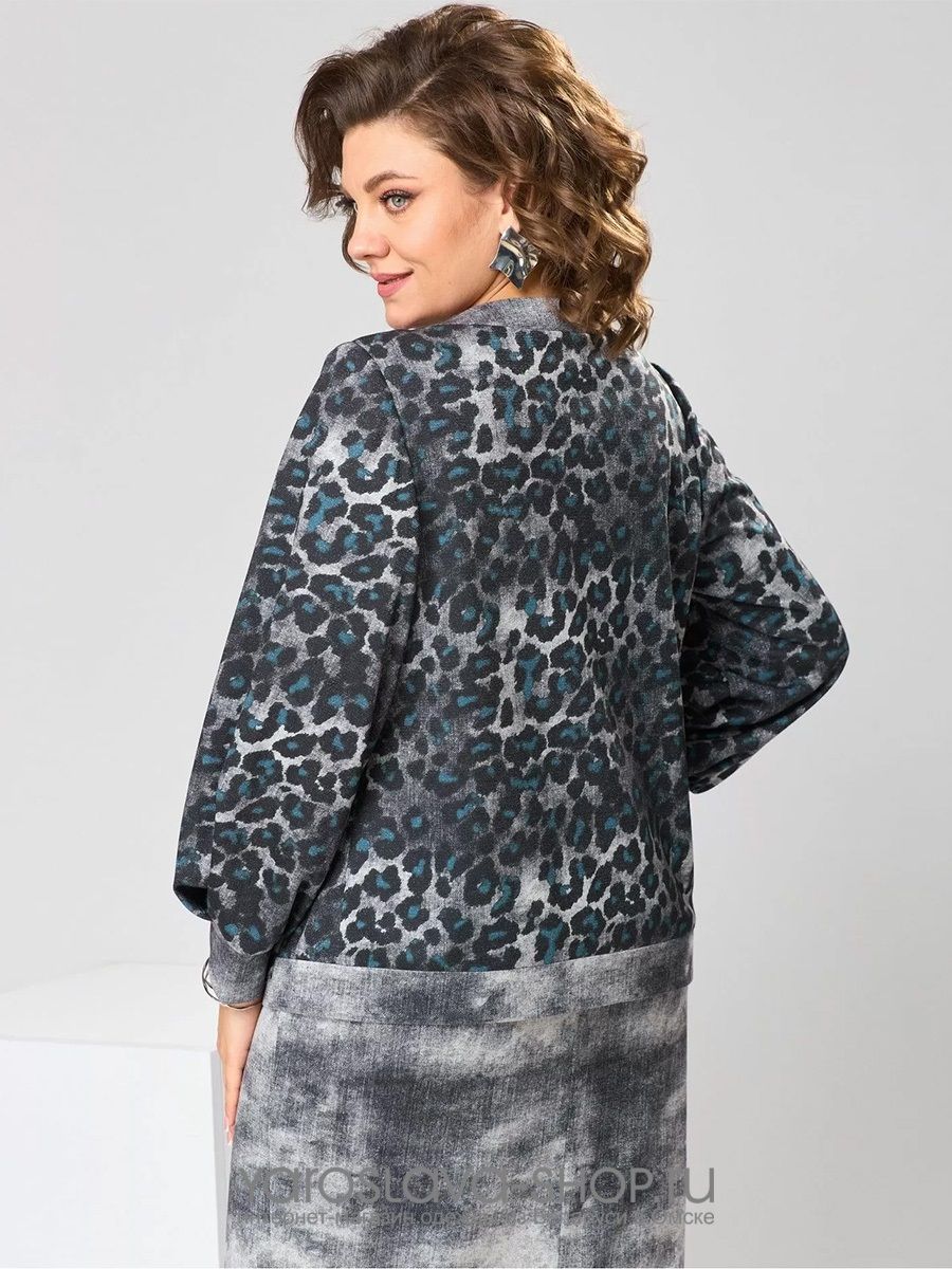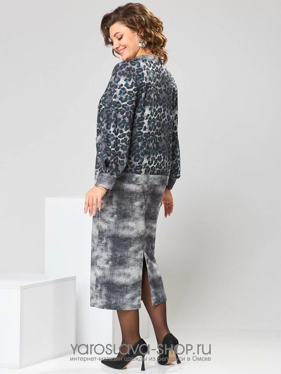 Костюм женский двух предметный: джемпер и юбка предназначен для повседневной носки. Джемпер прямого силуэта, длиной до линии бедер. Перед цельнокроеный, декорирован худ. Вышивкой. Спинка цельнокроеная. Горловина круглая, с втачной фигурной планкой из отделочной ткани. Джемпер со спущенной проймой. Рукав втачной, одно шовный, длиной 7/8. Юбка прямая, длиной ниже колена. Переднее полотнище с двумя боковыми фигурными карманами. Заднее полотнище с двумя таллиевыми вытачками. Застежка спереди на 8 металлических кнопок. Верхний срез с притачным поясом, с 4 надстрочными шлевками, между карманами и вытачками заднего полотнища пояс собран на эластичную тесьму. Юбка на подкладке.