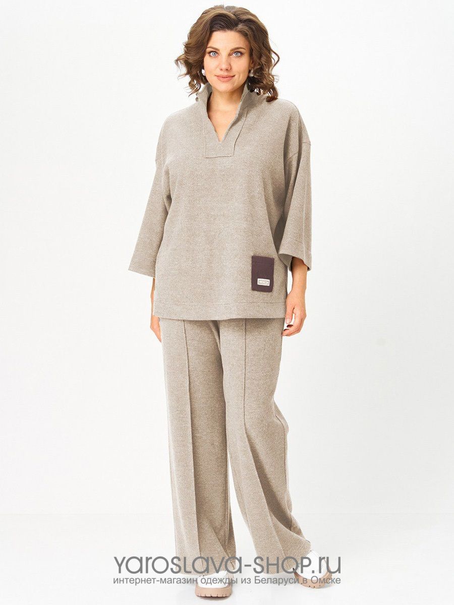 Костюм женский, трикотажный ,состоит из туники и брюк. Туника прямого силуэта, со спущенным плечевым швом, с круглым вырезом горловины, обработанной воротником стойка,переходящим в планку с разрезом. Перед с накладным карманом с левой стороны. На кармане отделочная нашивка. Рукава спущенные,одношовные,длиной 3/4. В боковых швах туники разрезы. Брюки прямого силуэта, с притачным поясом на резинке.