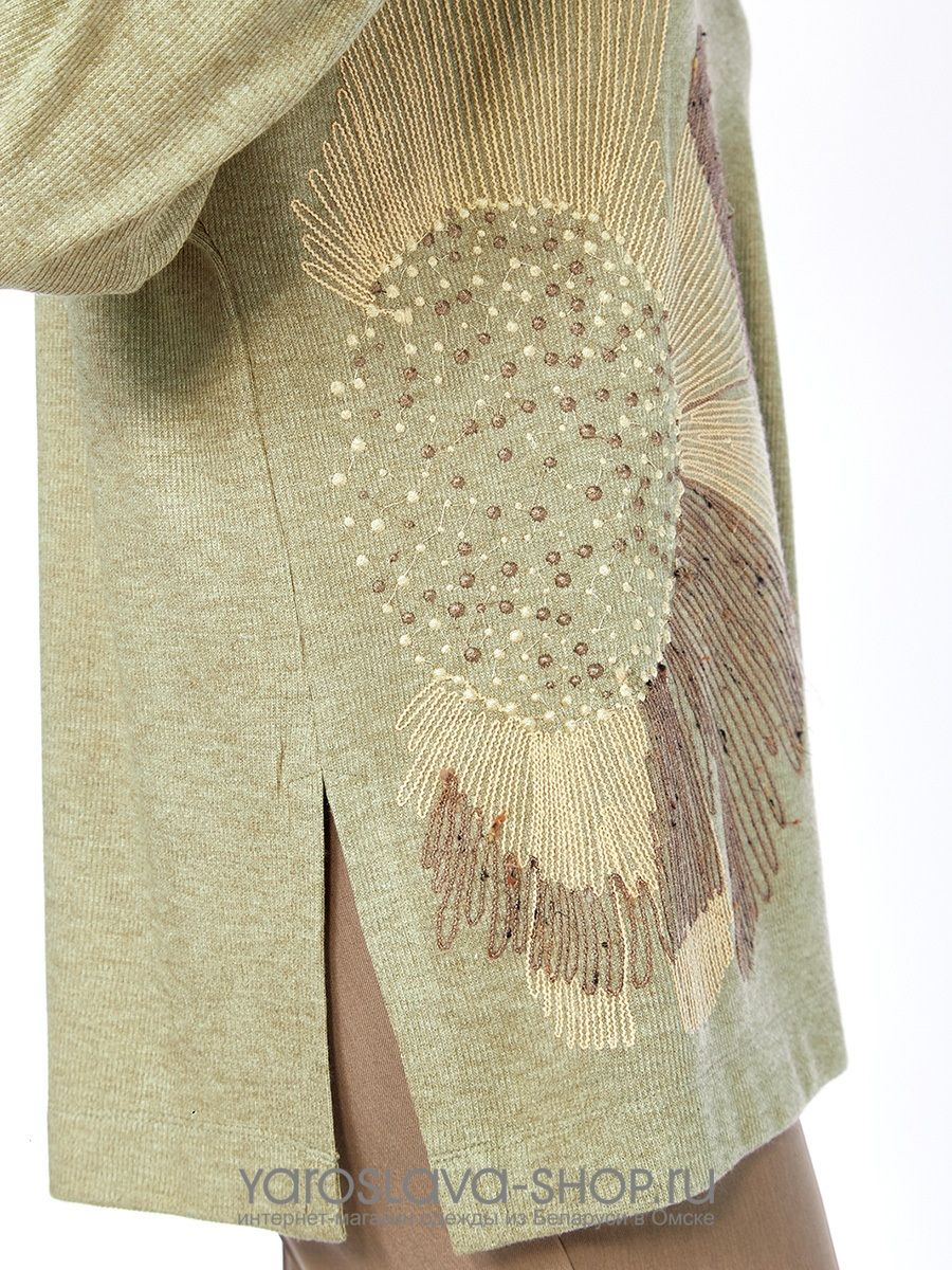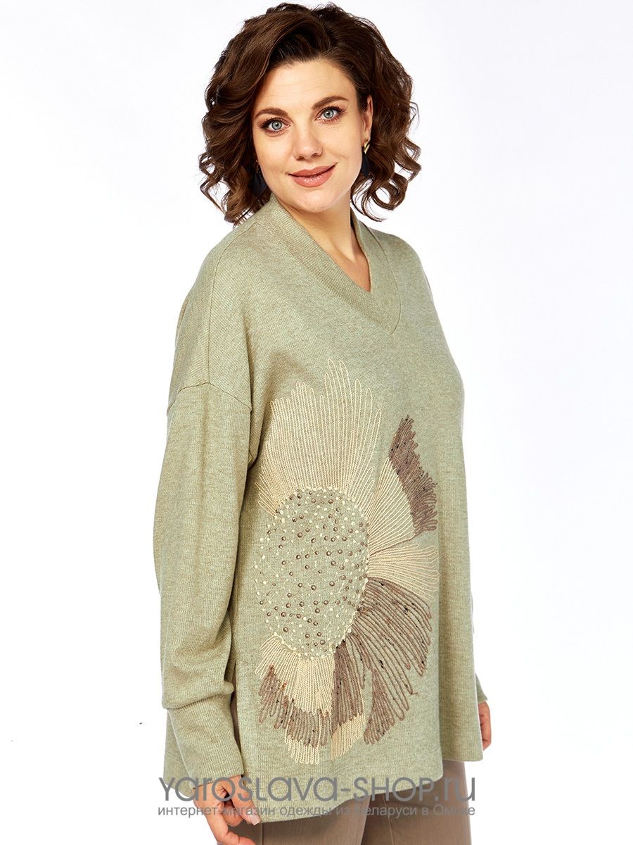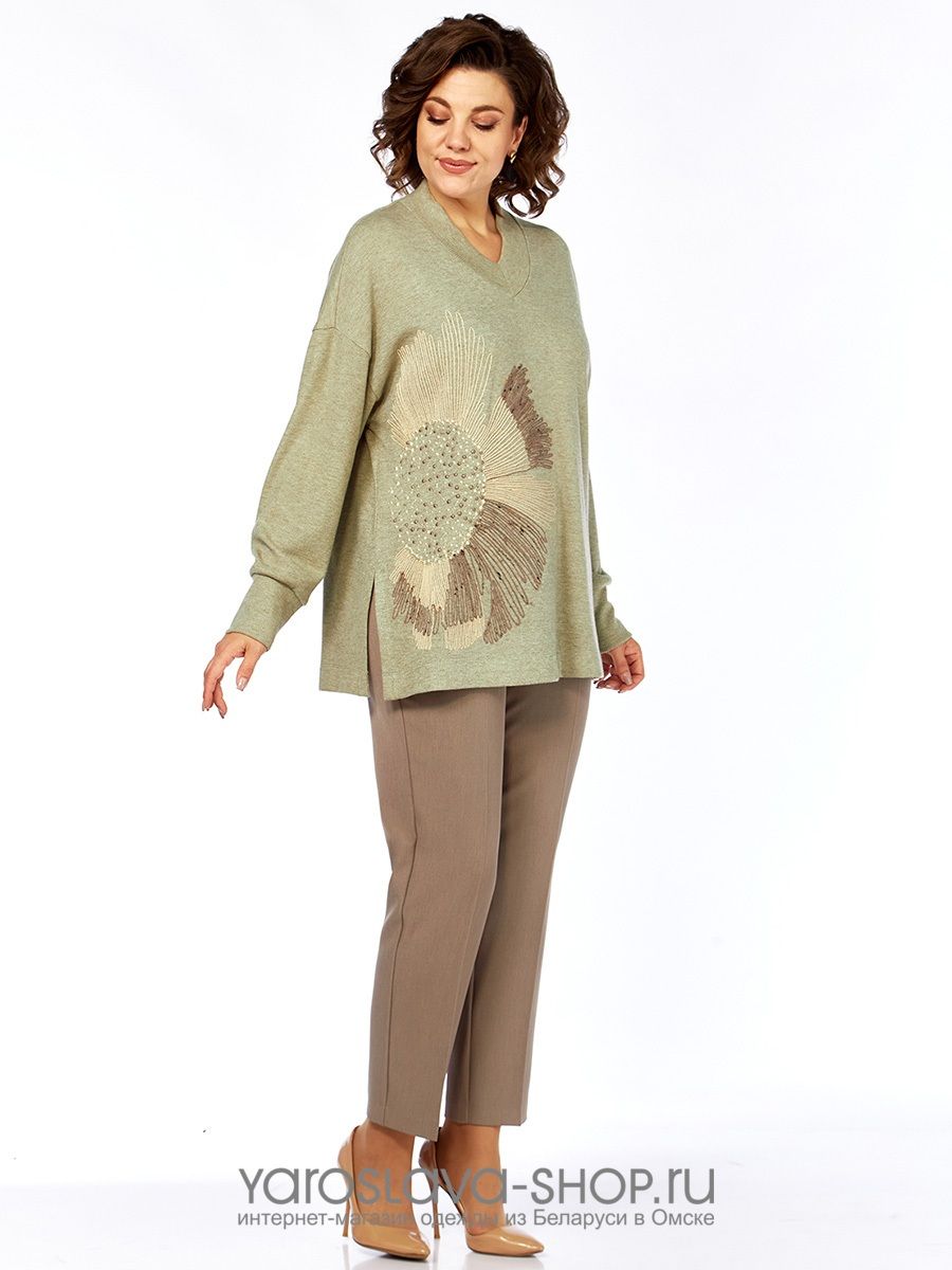 Комплект женский брючный, состоит из джемпера и брюк. Джемпер свободного кроя, изготовлен из трикотажного полотна. Горловина V-образной формы. На полочке-вышивка. Спинка цельнокроенная. Рукава спущенные, с манжетами по низу. В боковых швах-разрезы. Брюки классические из костюмной ткани. В брюках обработан пояс, частично на резинке. Застежка на молнию, петлю и пуговицу. В брюках обработаны боковые карманы. Сзади обработана кокетка.