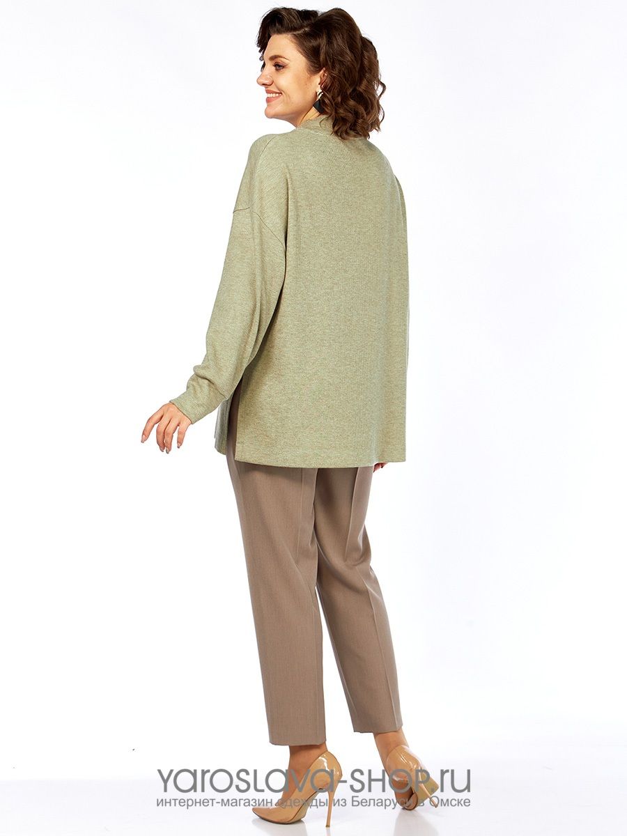 Женский костюм с трикотажным джемпером зеленого цвета и бежевыми брюками