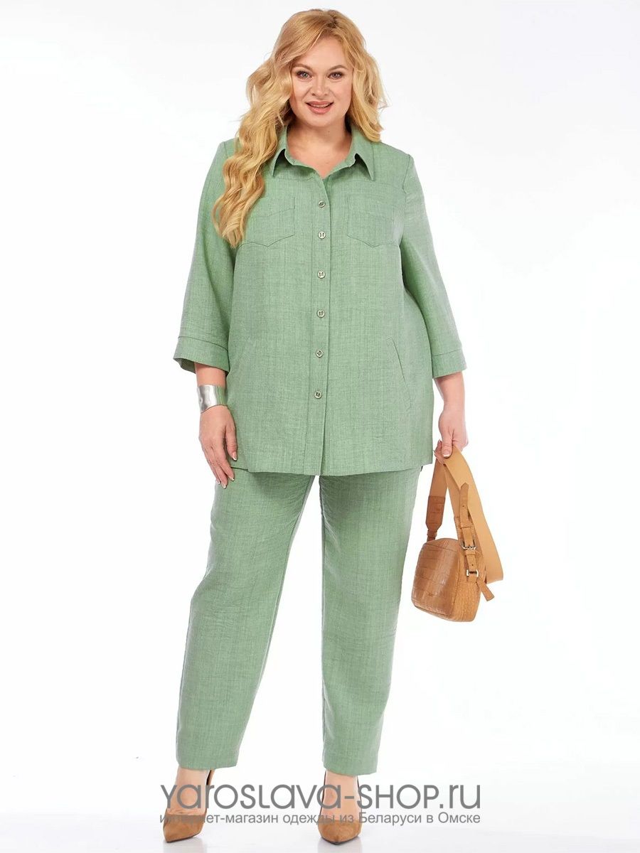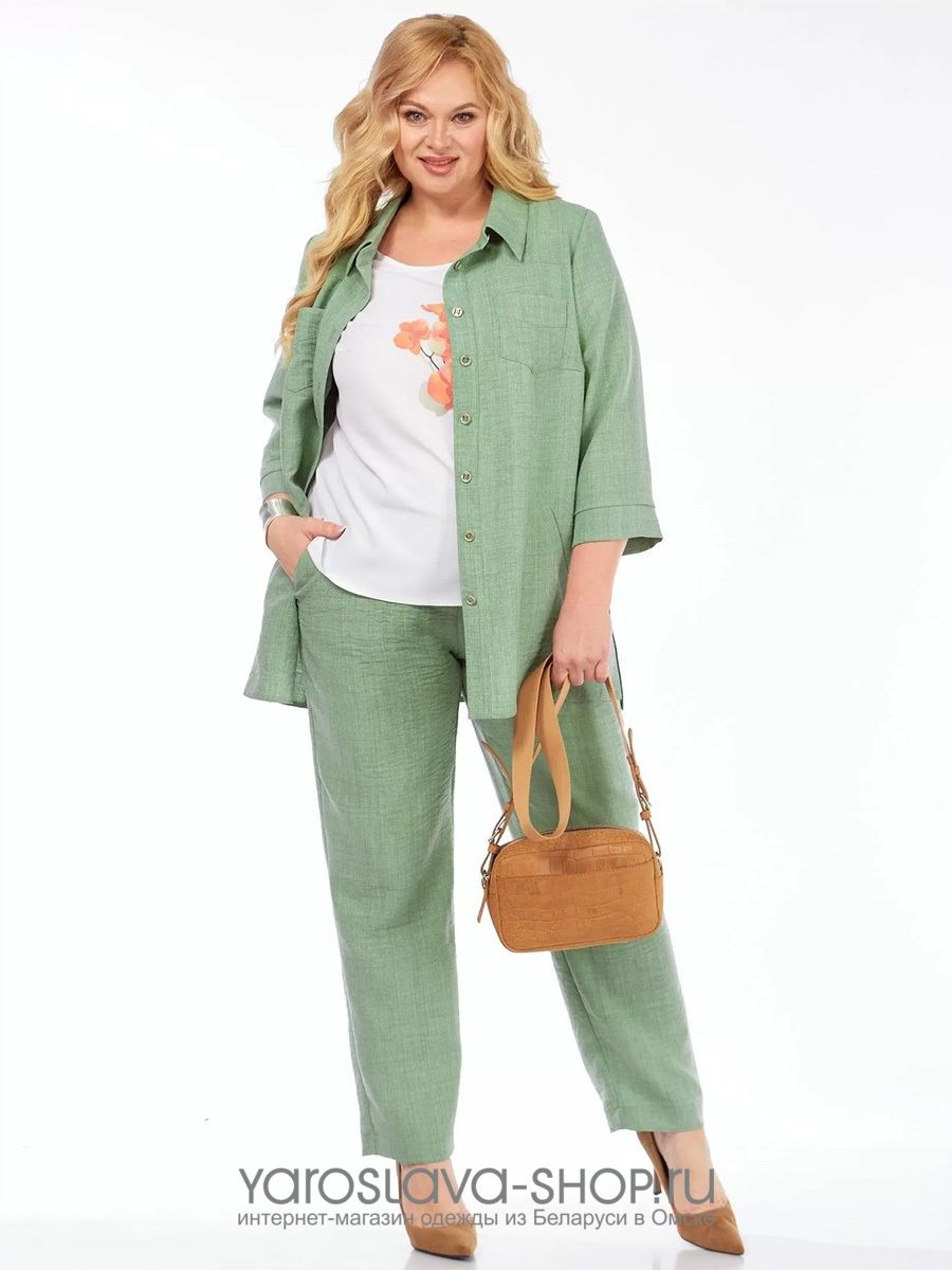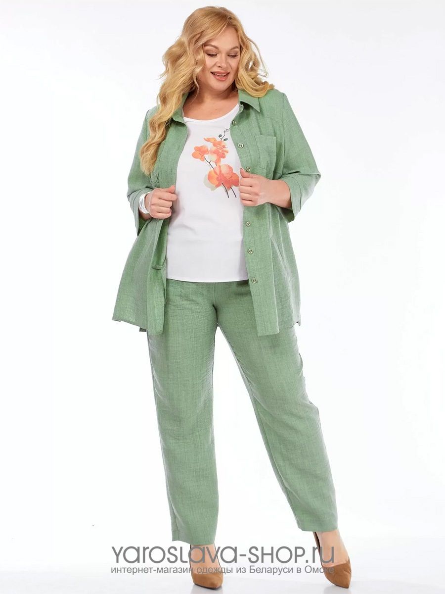 Женский трёхпредметный комплект, состоящий из жакета-рубашки, брюк и блузы в оливковом цвете