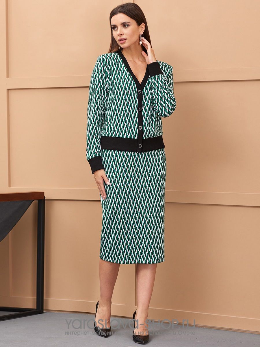 Костюм женский изготовлен из трикотажной ткани. Низ жакета, рукава и край борта обработан довязом. Жакет имеет v-образный вырез.Застёгивается на четыре петли пуговицы.Юбка прямая, на подкладке, на поясе слегка зауженная к низу. Длина ниже линии колена. Средний шов юбки заканчивается шлицей.