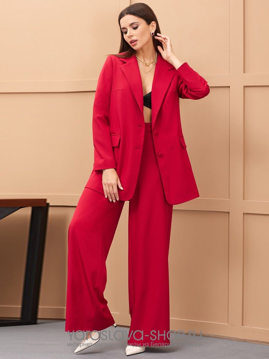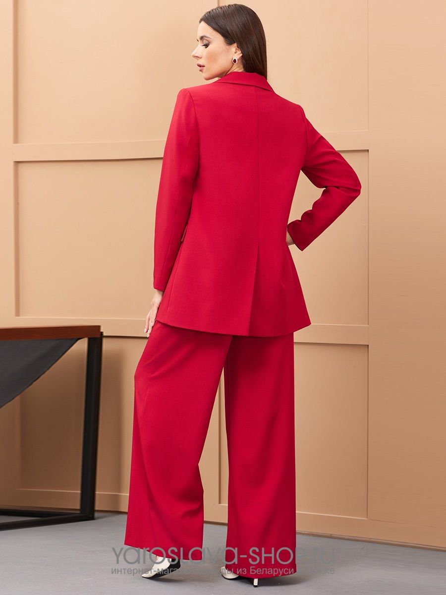 Костюм брючный красного цвета выполнен из текстильной ткани костюмно-плательной группы