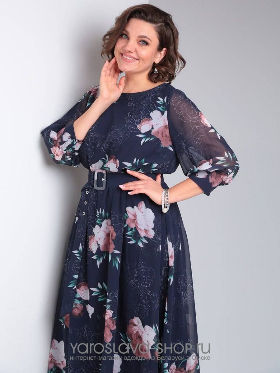 Элегантное шифоновое платье в синем цвете с цветочным принтом