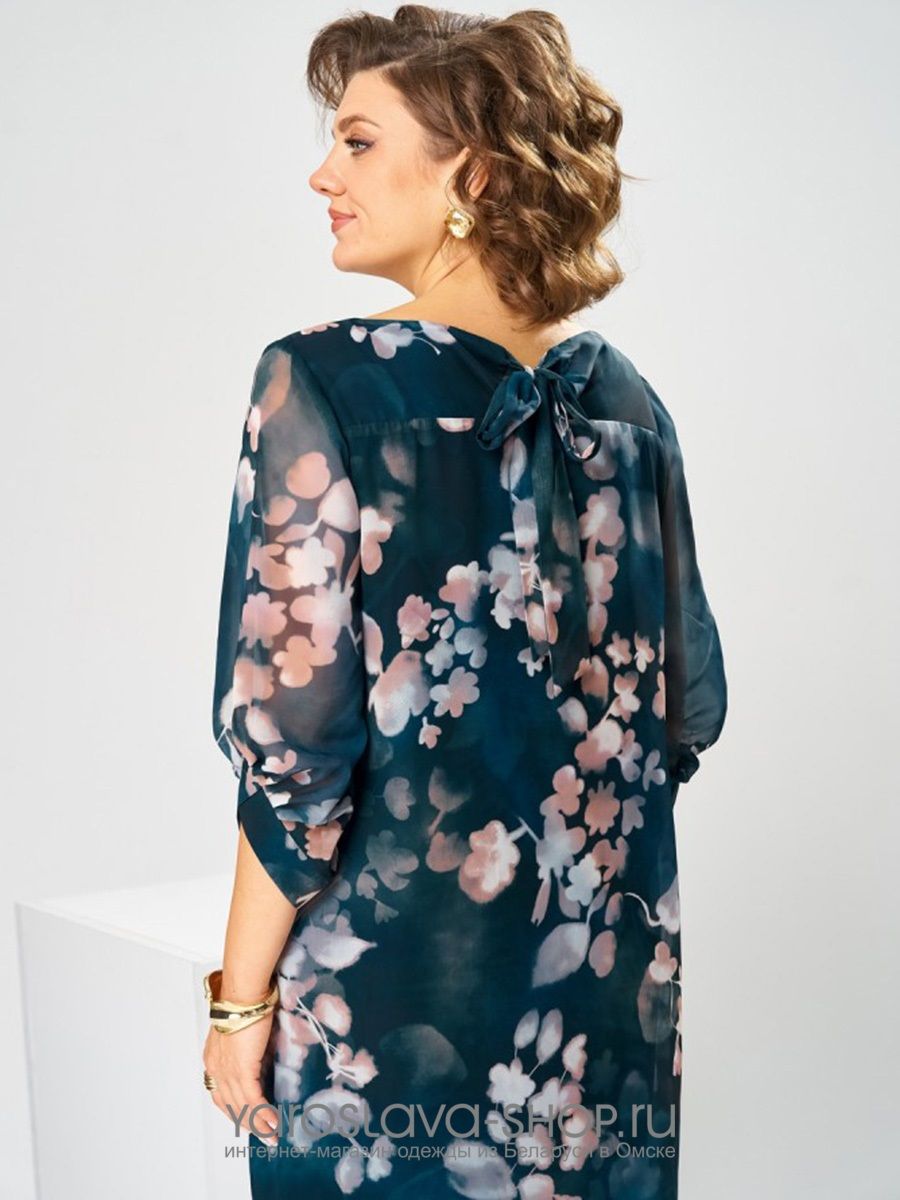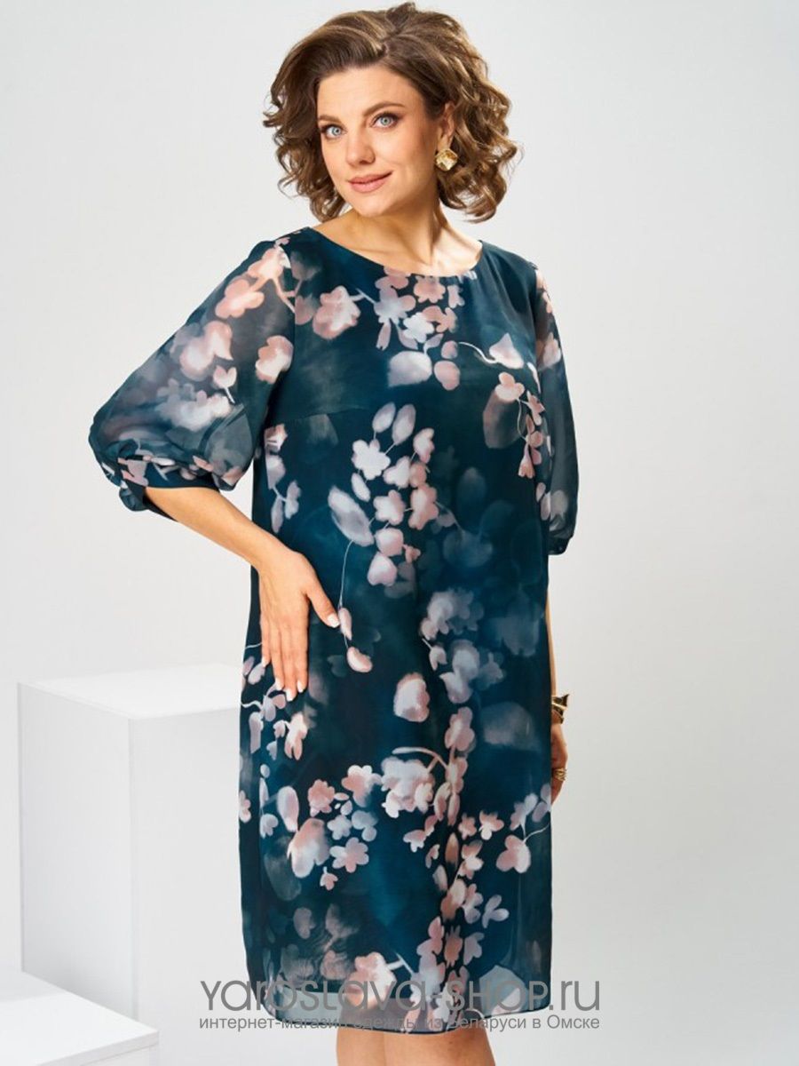 Женское платье прямого силуэта в синем цвете с цветочным принтом