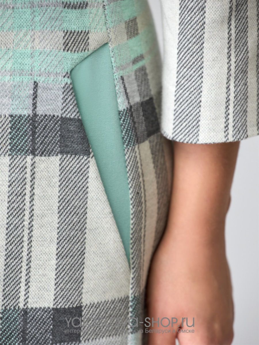Повседневное платье мятно-серого цвета в клетку с декоративной вставкой из отделочной ткани. Платье выполнено из трикотажа. Силуэт полуприлегающий. По переду ассиметричный подрез с декоративной вставкой и клапаном. Линия плеча спущенна. Рукава с декоративной контрастной вставкой. В среднем шве спинки вверху выполнена застежка- молния. В боковых швах карманы.