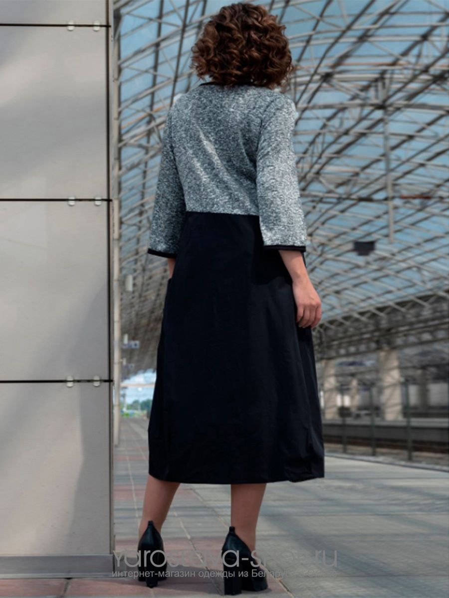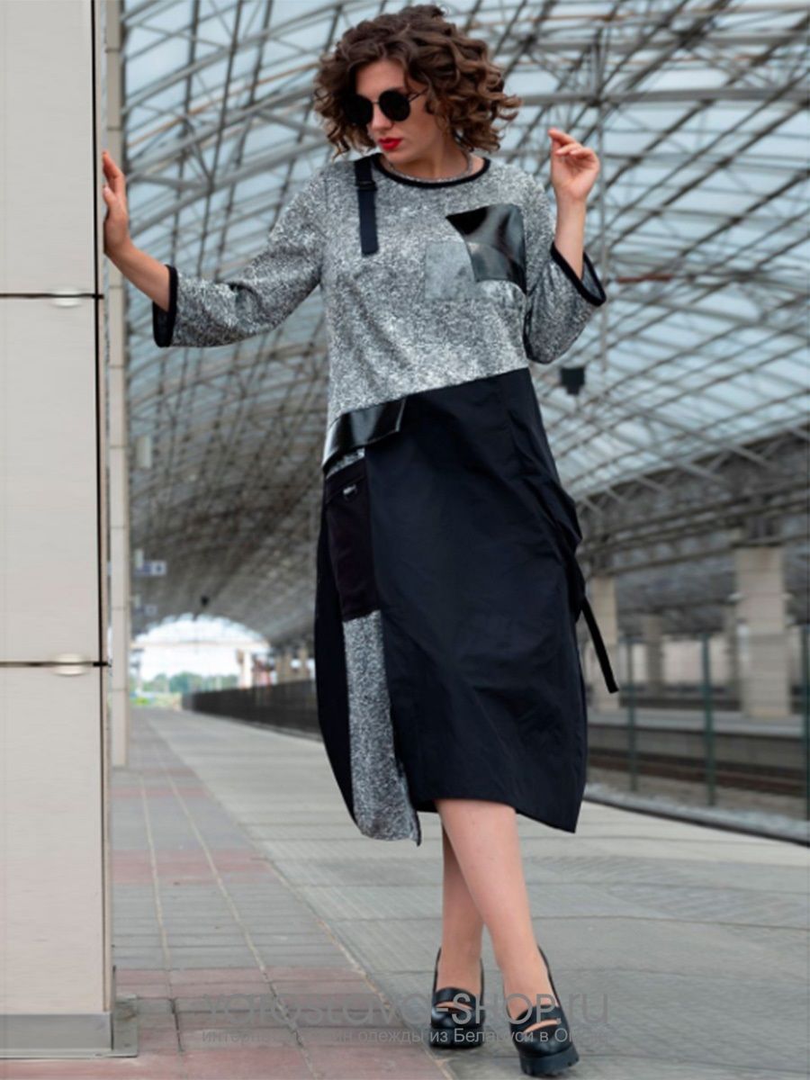 Комбинированное трикотажное платье свободного кроя. Горловина округлой формы. Рукава втачные, 7/8, одношовные. По переду изделие украшено карманами и шлицей. Нижняя часть платья выполнена из костюмно-плательной ткани тафта. Ткань плотная, не просвечивает.
