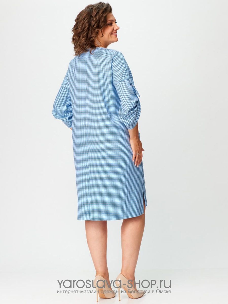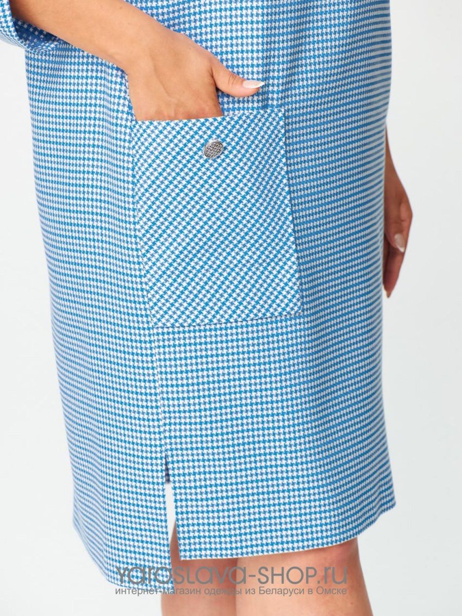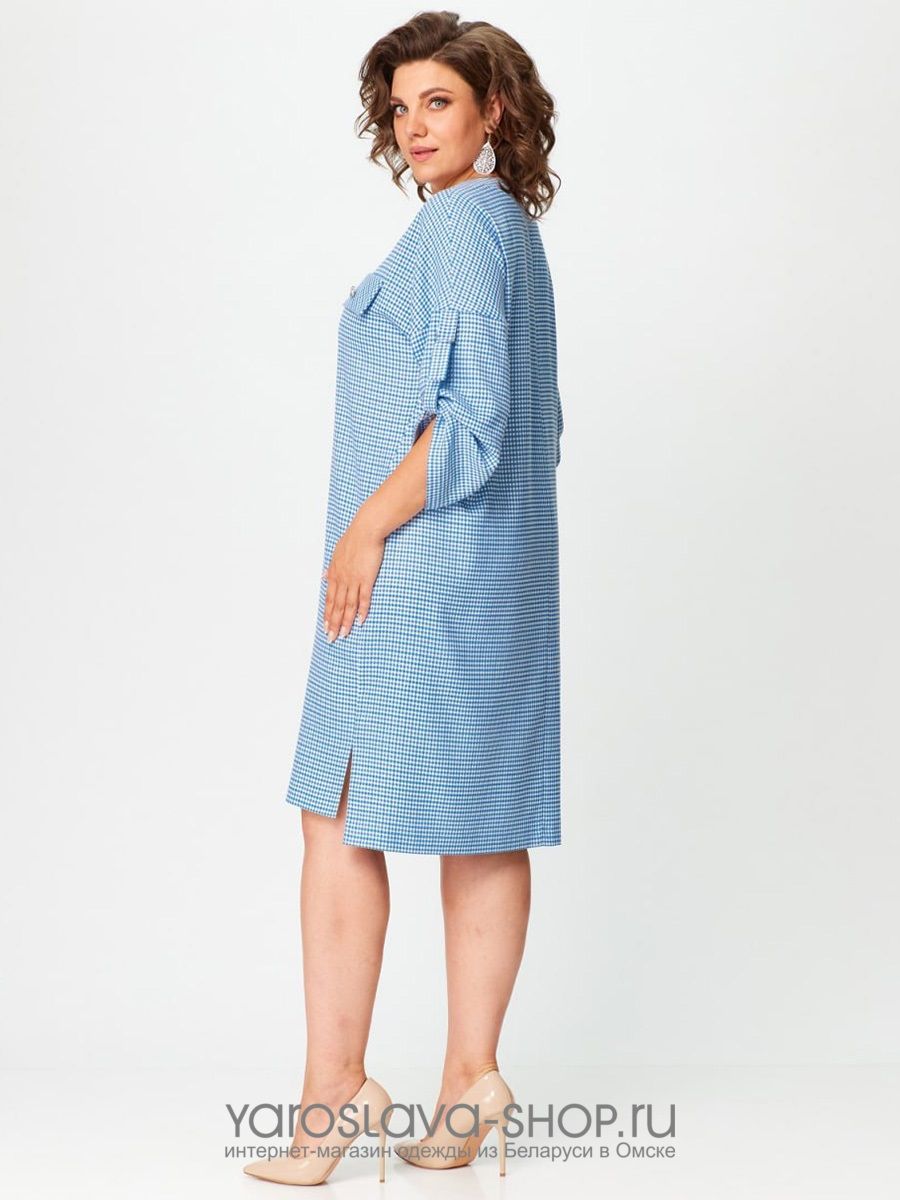 Нарядное женское платье голубого цвета в мелкую клетку