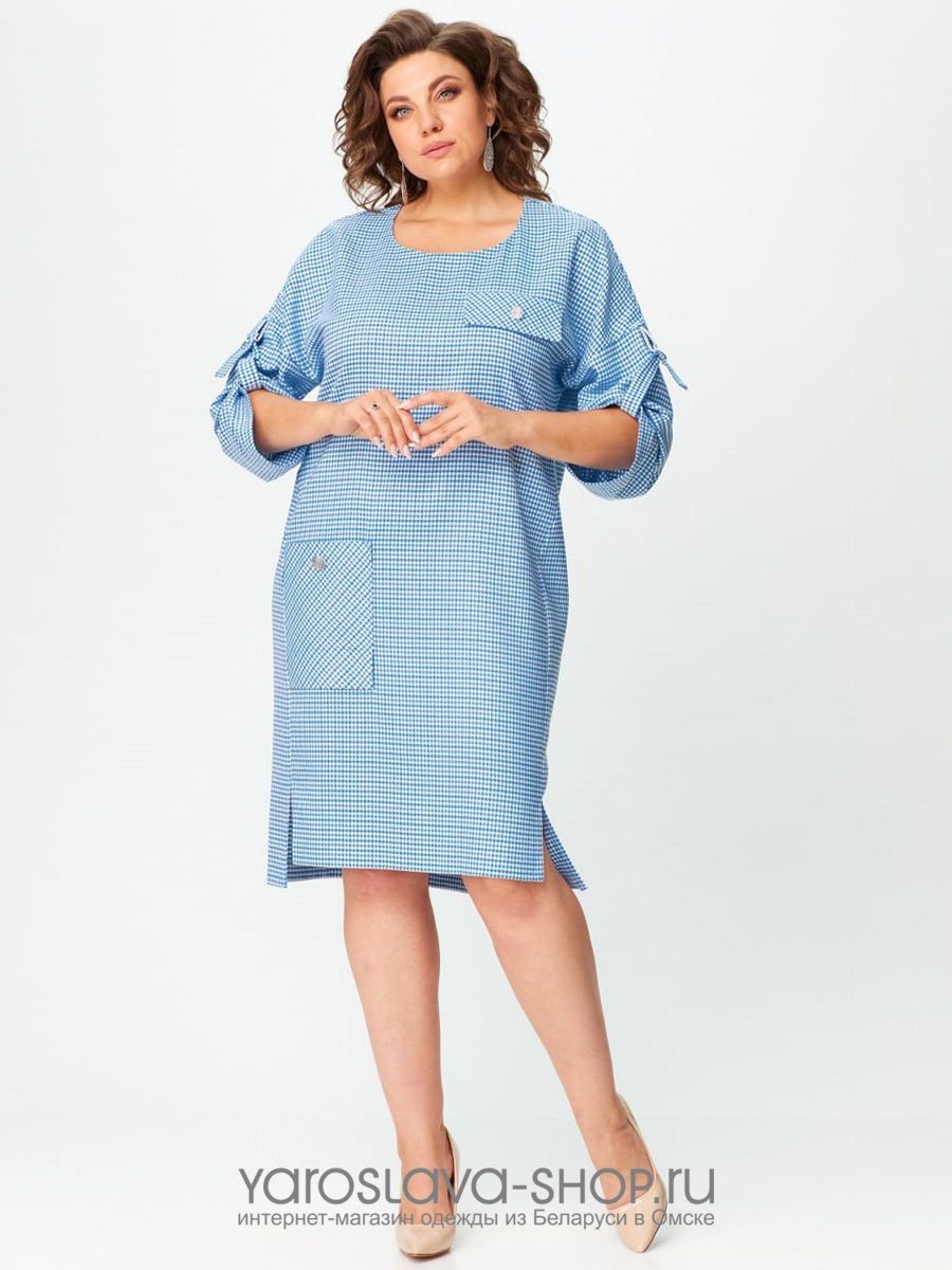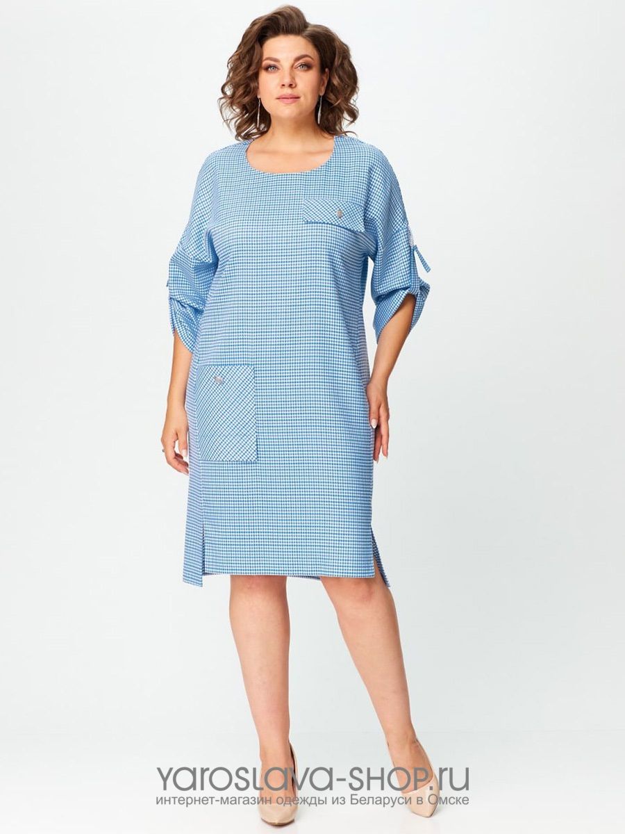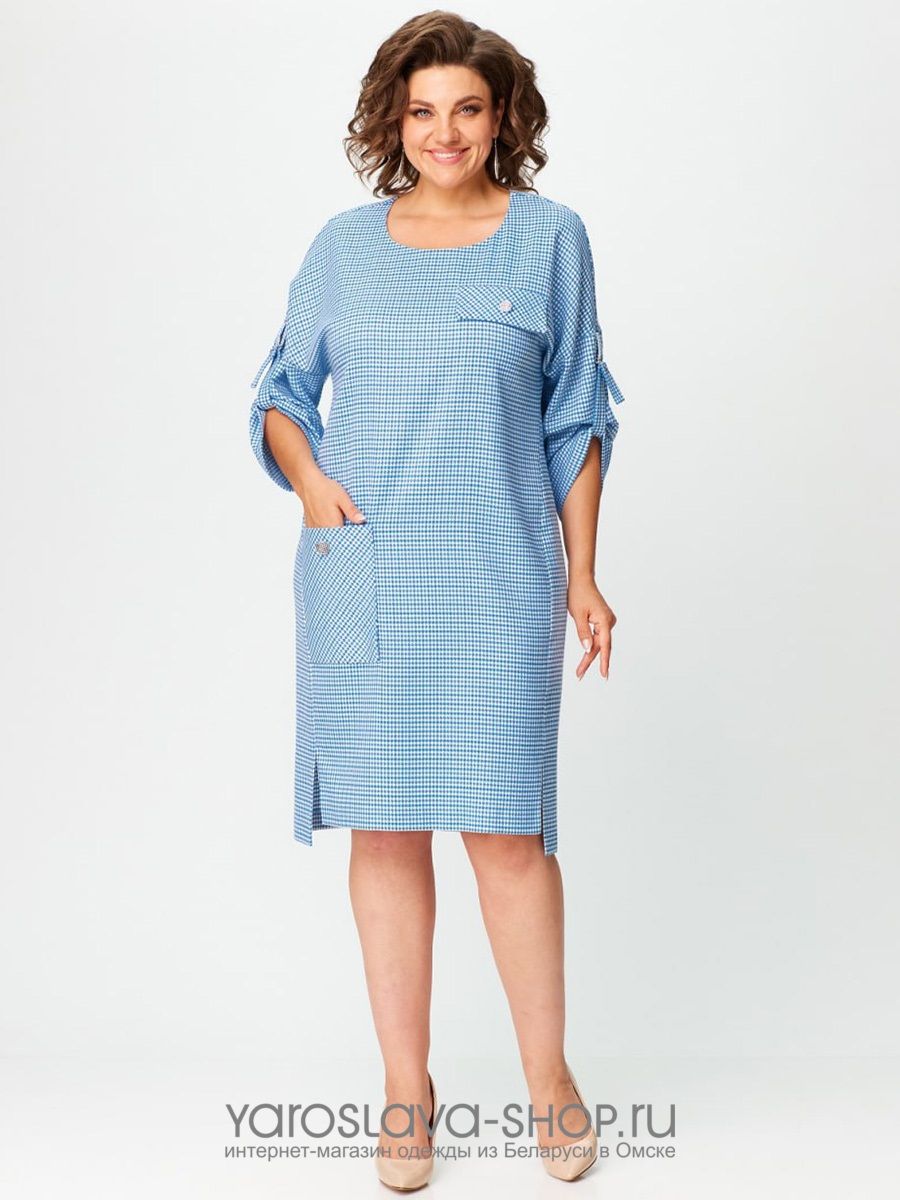 Нарядное женское платье голубого цвета в мелкую клетку