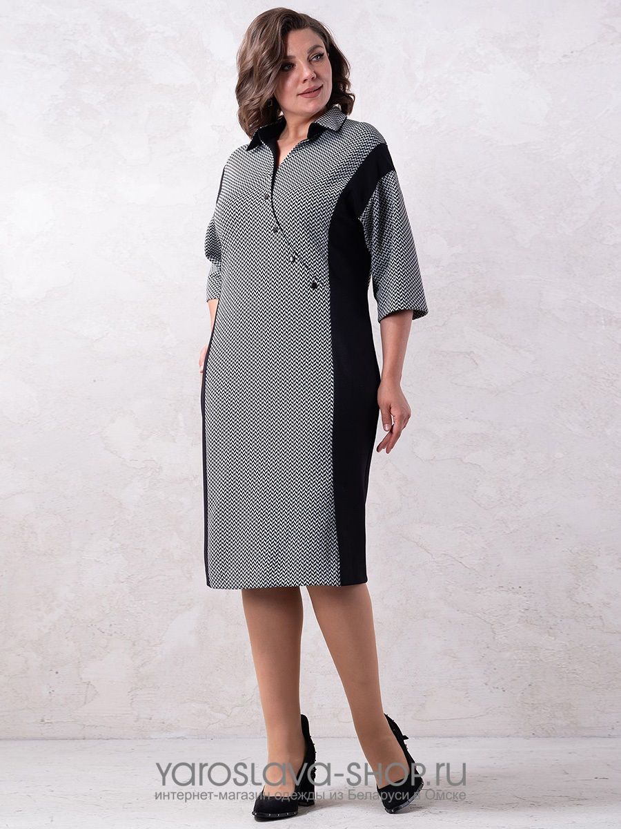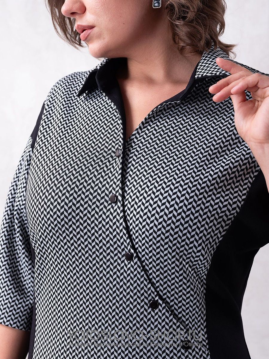 Элегантное трикотажное платье серо-черного цвета с рубашечным воротником