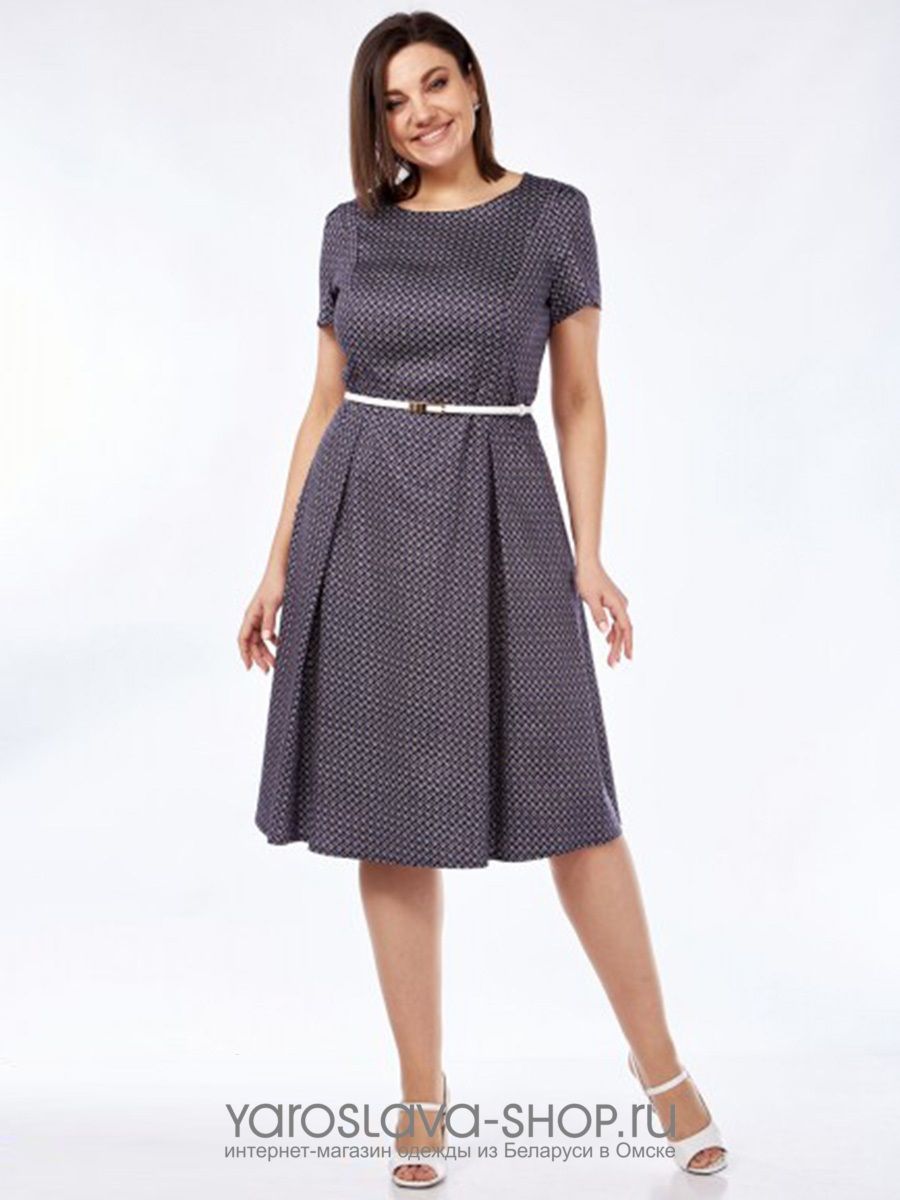 Платье А-силуэта, с круглым вырезом горловины. Перед с рельефами от плечевого шва, складкой на уровне линии талии. Спинка с рельефами от плечевого шва, складкой на уровне линии талии, обработанной потайной застежкой-"молнией" в среднем шве. В верхней части спинки обработана отделочная деталь. Рукав короткий, втачной, одношовный, со складками по окату. Платье комплектуется съемным поясом.