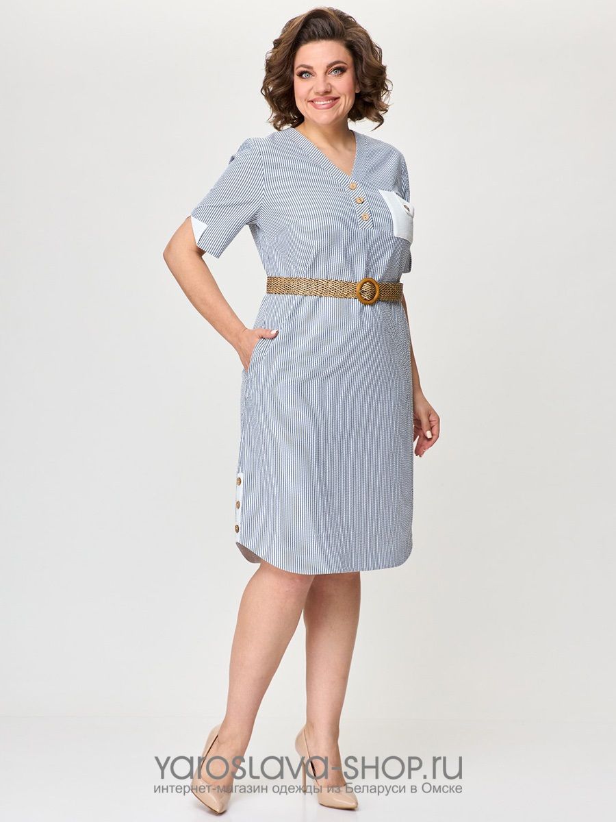 Изделие без подкладки, в среднем шве спинки потайная молния. Перед имеет V-образный вырез, переходящий в застёжку из трёх пуговиц и петель. Спереди имеются нагрудные вытачки, спинка прямая, без вытачек. Спереди слева настрочен накладной карман белого цвета, край которого подвернут вниз в виде треугольника и закреплён пуговицей. Платье средней длинны, прикрывает колено. Низ наряда в боковых швах закруглен. Рукав платья длинной до локтя, одношовный, втачной. Внизу рукова имеется обтачка с разрезом, края которого подвернуты вверх, закреплены в виде белых треугольников. Платье изготовлено из ткани премиального качества с большим количеством хлопка в составе, что делает его дышащим и идеальным для теплого времени года. Дизайн ткани в тонкую полоску белого и голубого цветов. Данная вертикальная полоска визуально вытягивает силуэт и стройнит, что особенно актуально для женщин не высокого и среднего роста. Прекрасно подойдёт и для обладательниц высокого роста. Платье имеет на первый взгляд простой крой, но благодаря декору из пат, пуговиц, кармана и пояса оно выглядит изящно и очень женственно. Благодаря хорошо разработанному крою идеально сидит по фигуре.