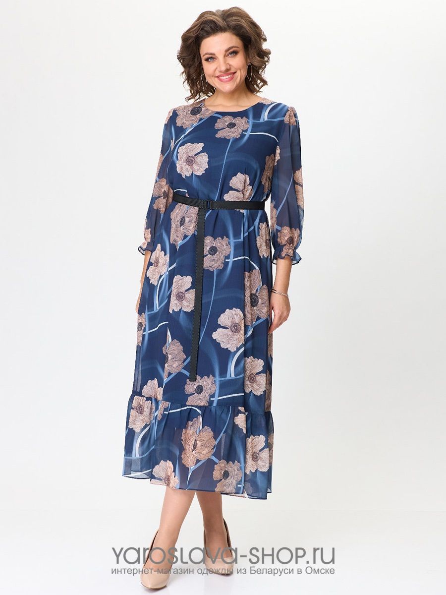 Женское платье из шифона в синем цвете с цветочным рисунком