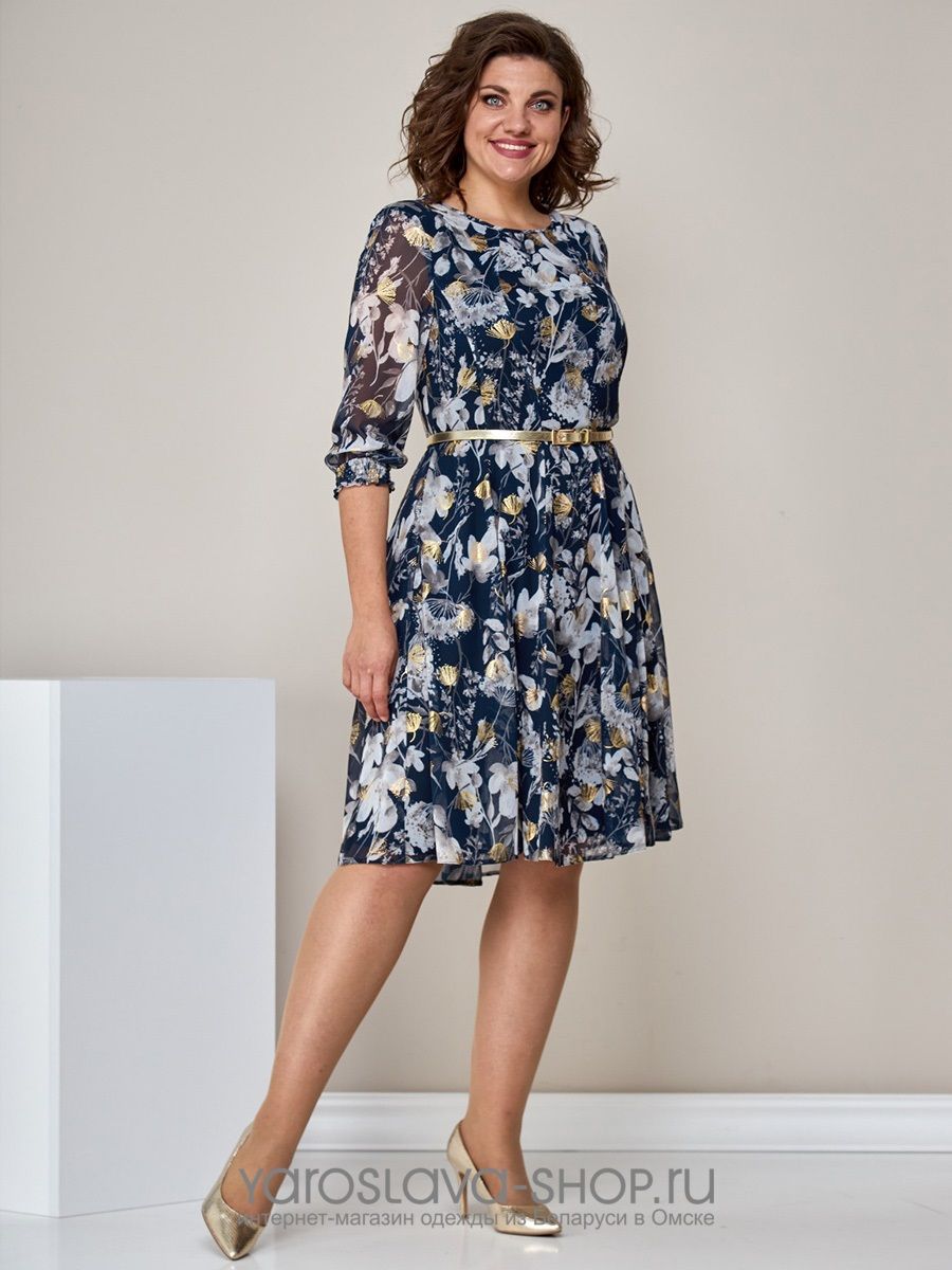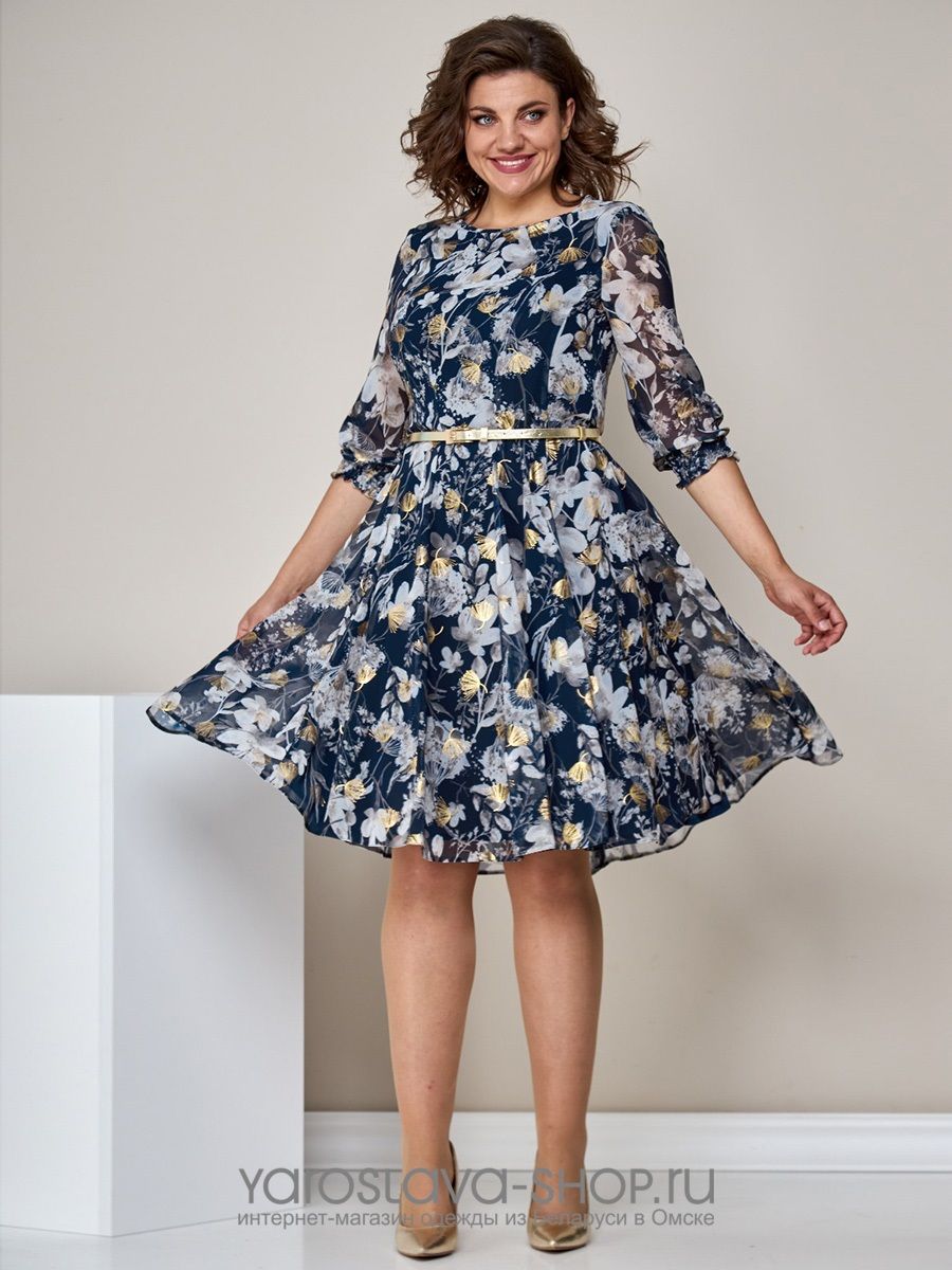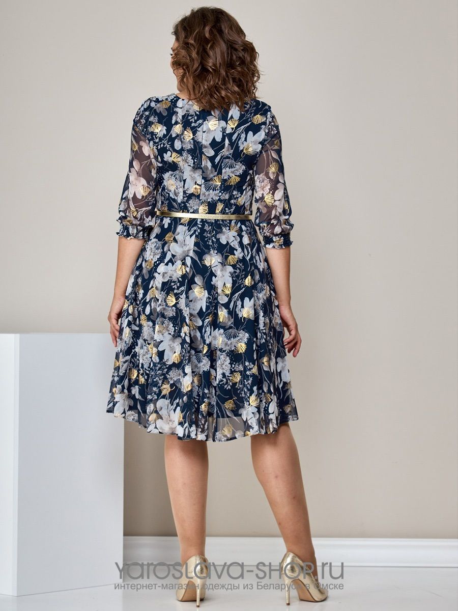 Шифоновое женское платье в синем цвете с цветочным принтом