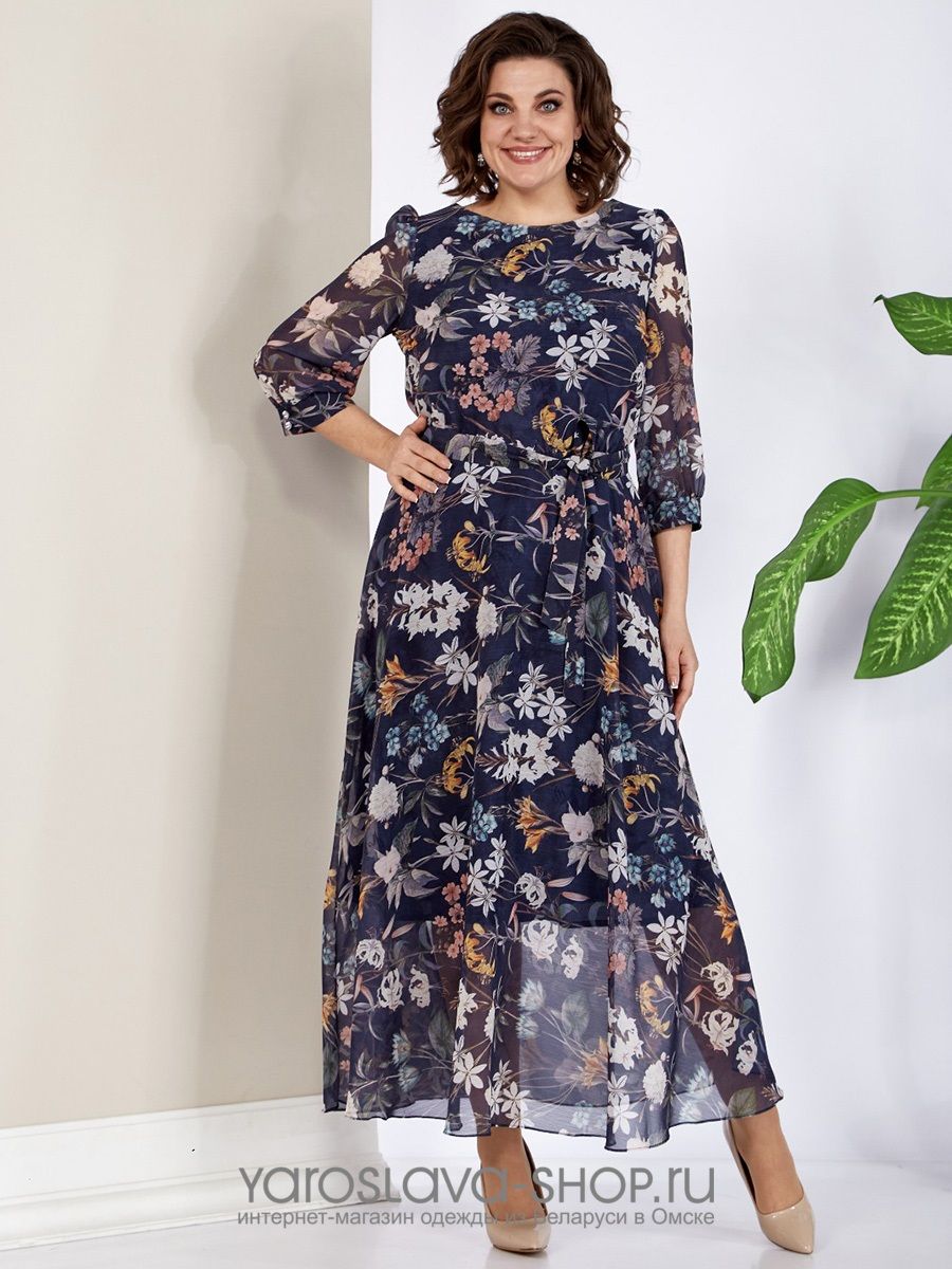 Элегантное шифоновое платье в синем цвете с цветочным принтом