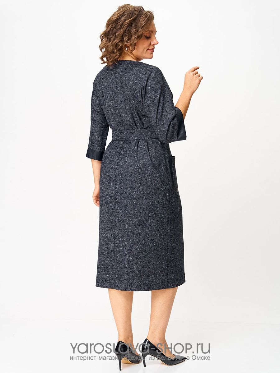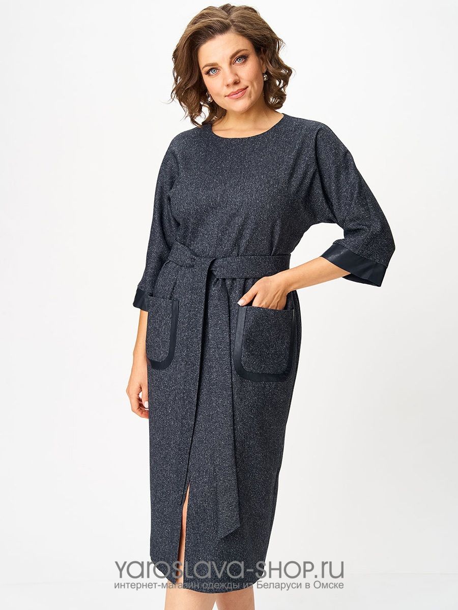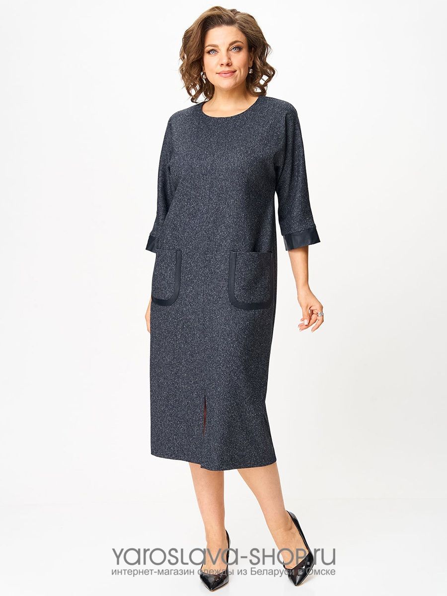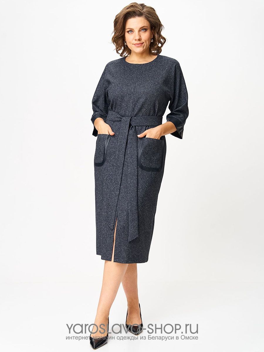 Платье женское стильное модное деловое офисное, прямого силуэта, из текстильного материала. С круглым вырезом горловины. С цельнокроеными рукавами. Низ рукавов с манжетами из эко - кожи. Деталь переда со средним швом, в котором обработан разрез и накладными карманами с закругленными концами с отделочной деталью из эко - кожи. Спинка со средним швом, в верхней части которого обработана потайная застёжка на тесьму - молнию. Платье белорусское комплектуется съемным поясом.