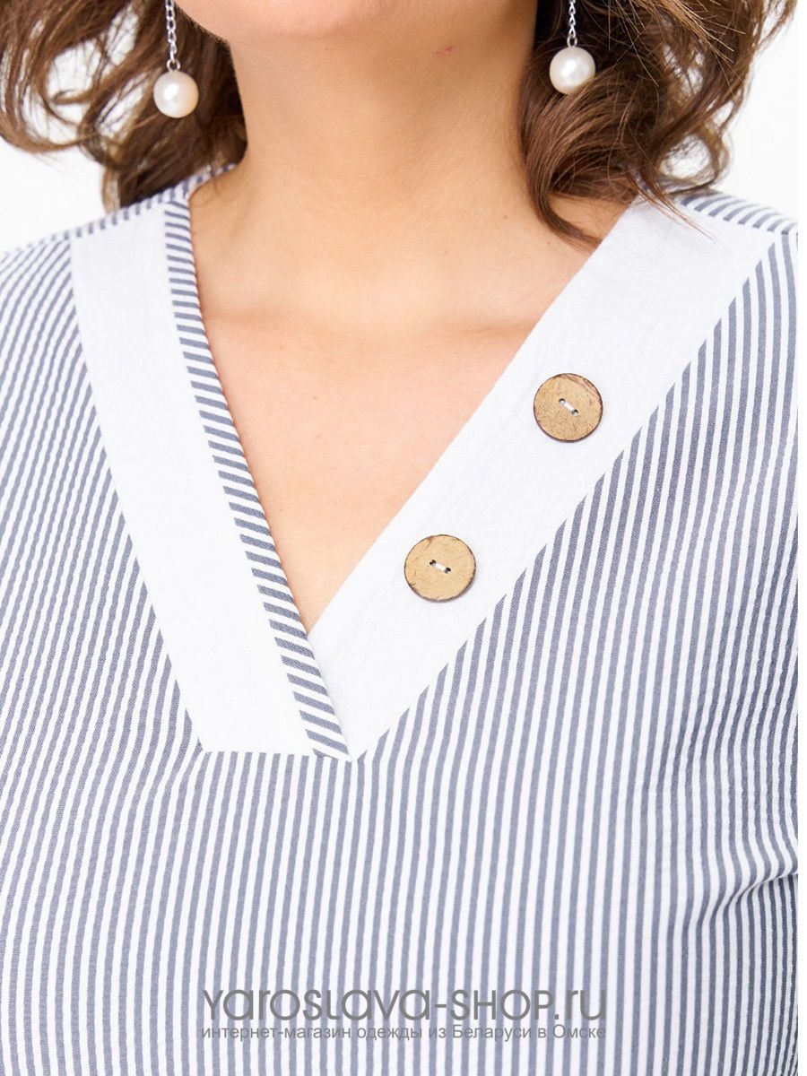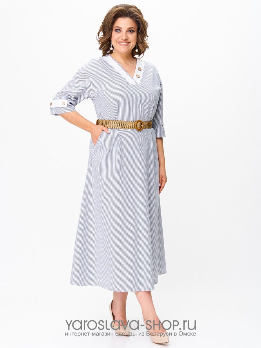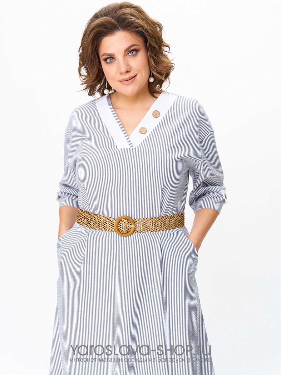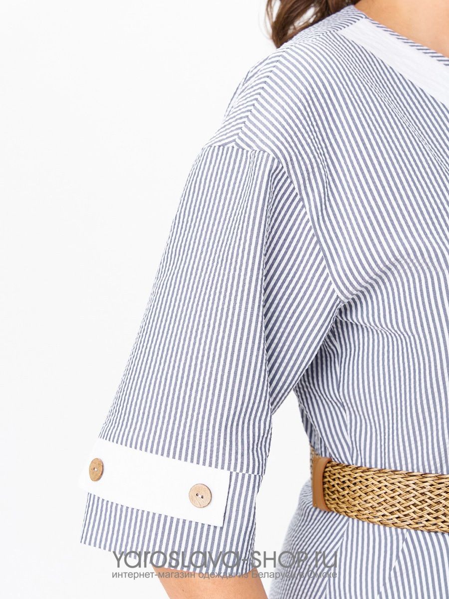 Изделие без подкладки, в среднем шве спинки потайная молния. Перед имеет V-образный вырез, переходящий в застёжку из трёх пуговиц и петель. Спереди имеются нагрудные вытачки, спинка прямая, без вытачек. Спереди слева настрочен накладной карман белого цвета, край которого подвернут вниз в виде треугольника и закреплён пуговицей. Низ наряда в боковых швах закруглен. Рукав платья длинной до локтя, одношовный, втачной. Внизу рукова имеется обтачка с разрезом, края которого подвернуты вверх, закреплены в виде белых треугольников. Платье изготовлено из ткани премиального качества с большим количеством хлопка в составе, что делает его дышащим и идеальным для теплого времени года. Дизайн ткани в тонкую полоску белого и голубого цветов. Данная вертикальная полоска визуально вытягивает силуэт и стройнит, что особенно актуально для женщин не высокого и среднего роста. Прекрасно подойдёт и для обладательниц высокого роста. Платье имеет на первый взгляд простой крой, но благодаря декору из пат, пуговиц, кармана и пояса оно выглядит изящно и очень женственно. Благодаря хорошо разработанному крою идеально сидит по фигуре.