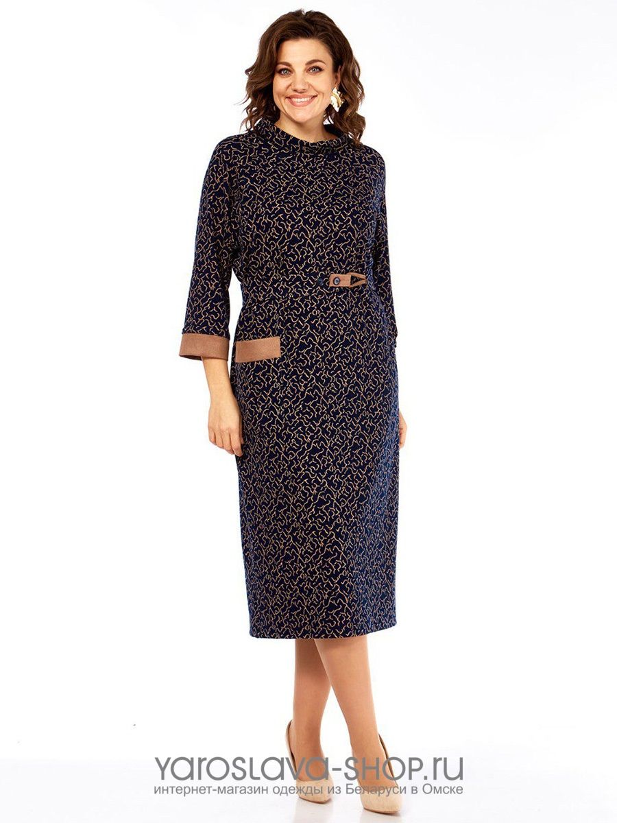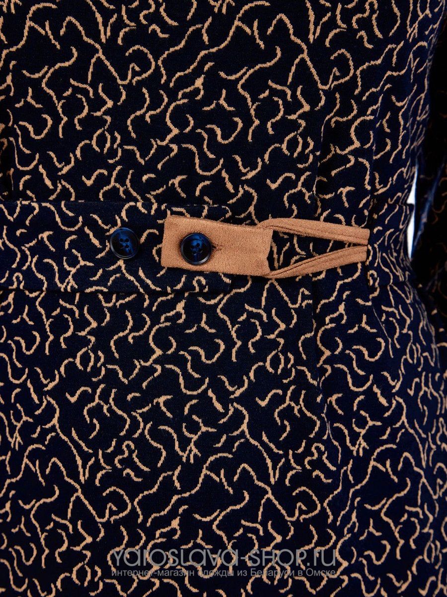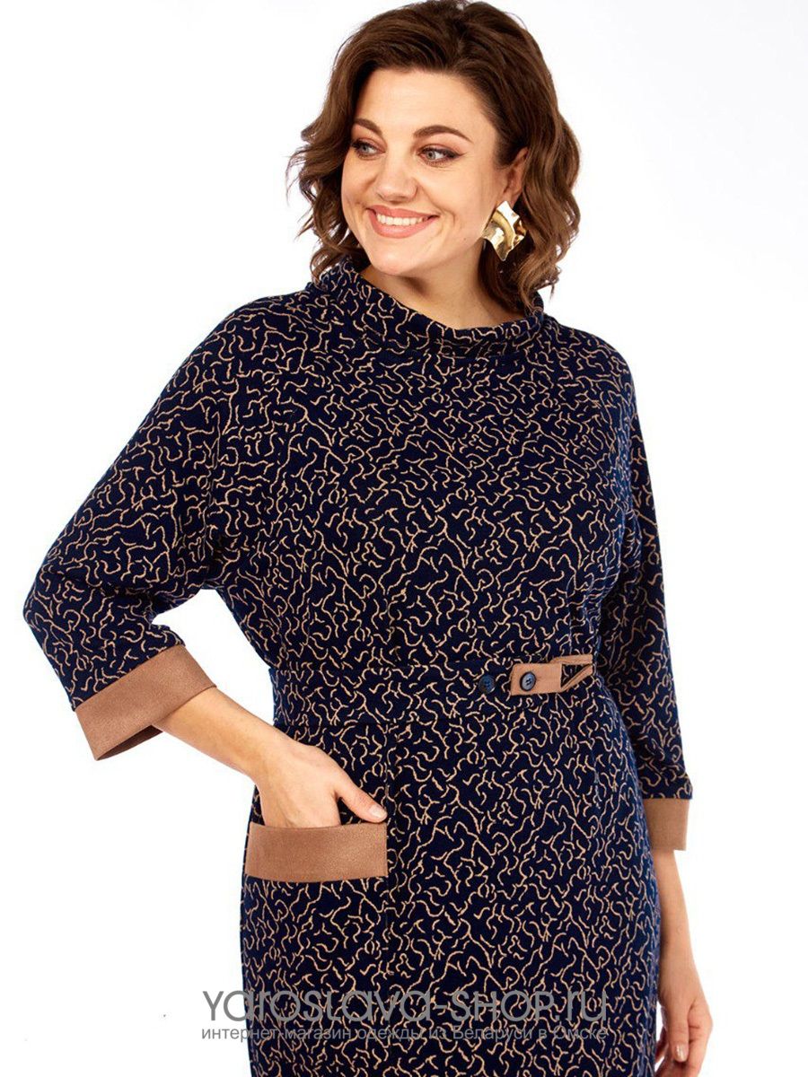 Платье женское, прямого силуэта, трикотажное. Платье с круглым вырезом горловины, обработанной воротником стойкой. Перед с накладным карманом с левой стороны, который входит в боковой шов. Карман с отрезной деталью из отделочной ткани. Рукава реглан длиной 3/4, с плечевой вытачкой и манжетами из отделочной ткани. Платье комплектуется съемным поясом на застежку петля-пуговицы. Петля и хлястик пояса из отделочной ткани.