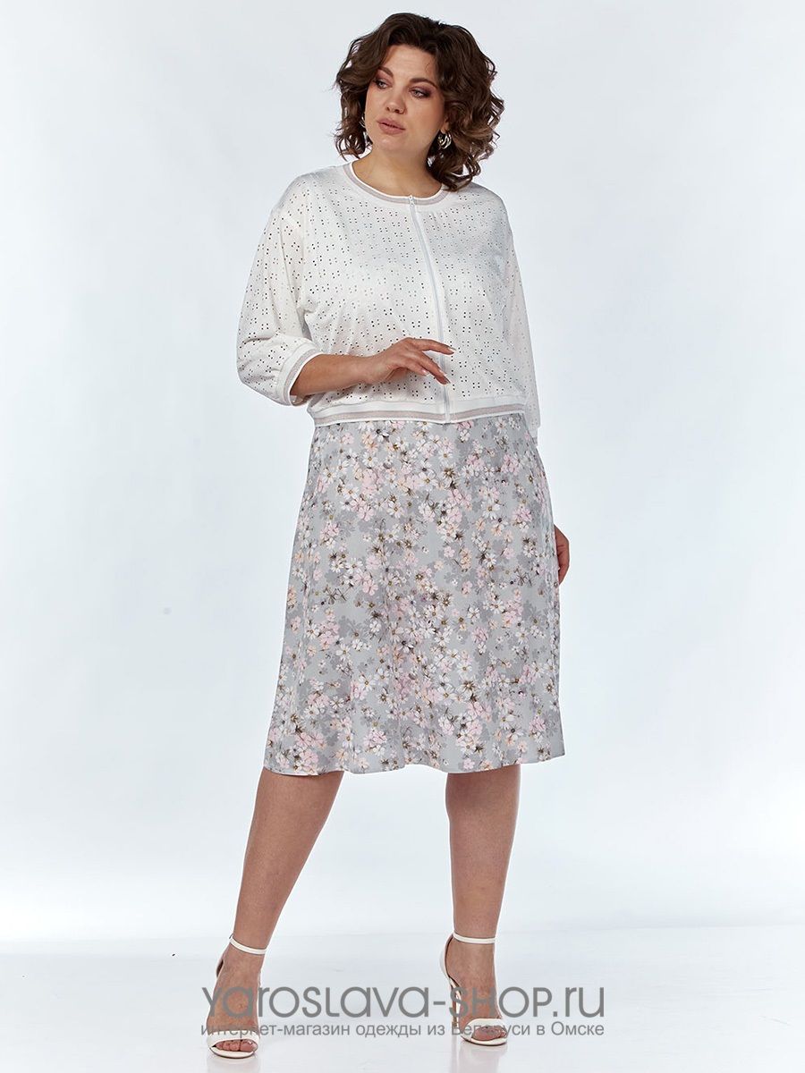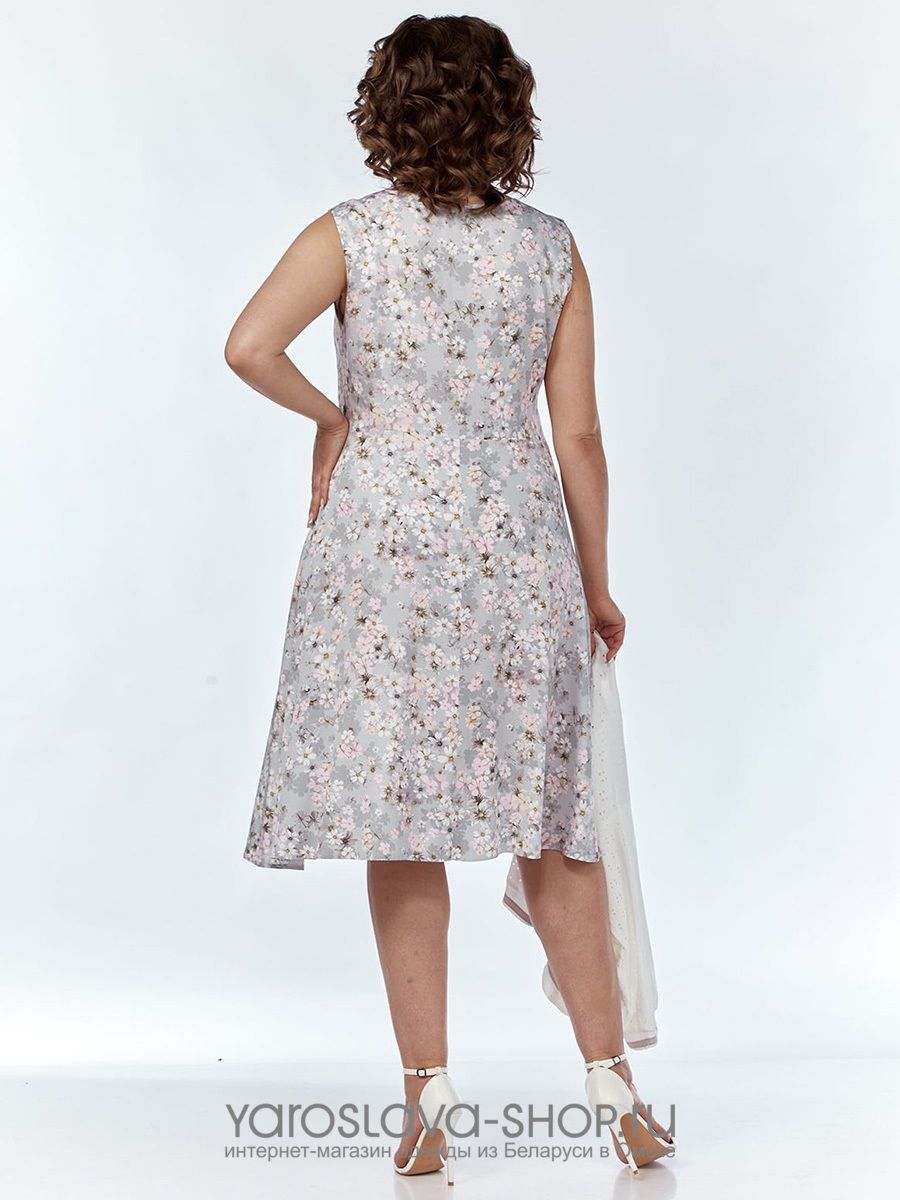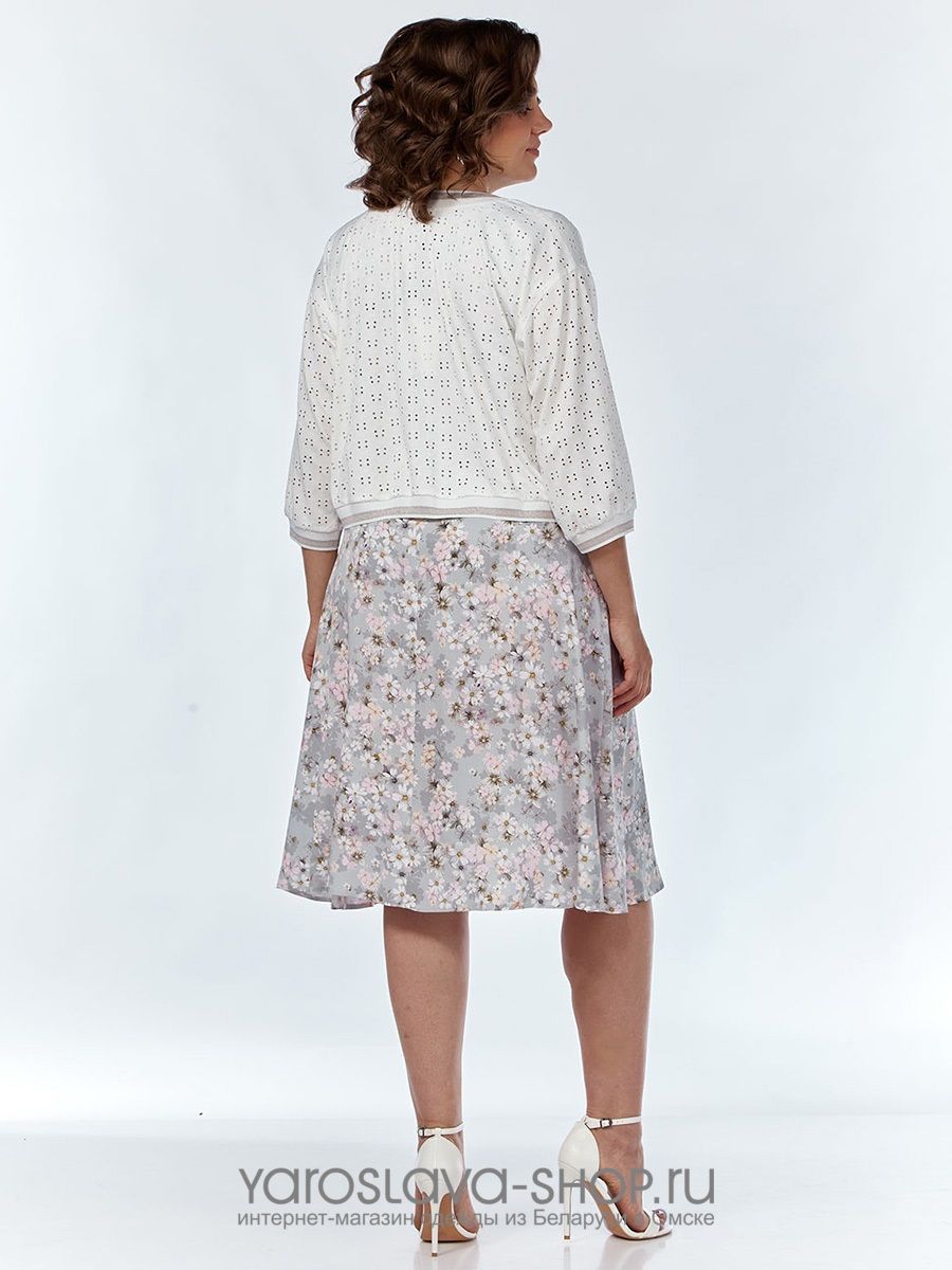 Романтическое платье из вискозы. По лифу платья выполнены нагрудные вытачки. По спинке средний шов и две талиевые вытачки. В боковом шве изделия присутствует потайная молния. Рукав короткий, вырез горловины округлой формы, на обтачке. По спинке выполнен разрез в виде капли и застежка на две пуговицы. Комплект дополнен легким жакетом.
