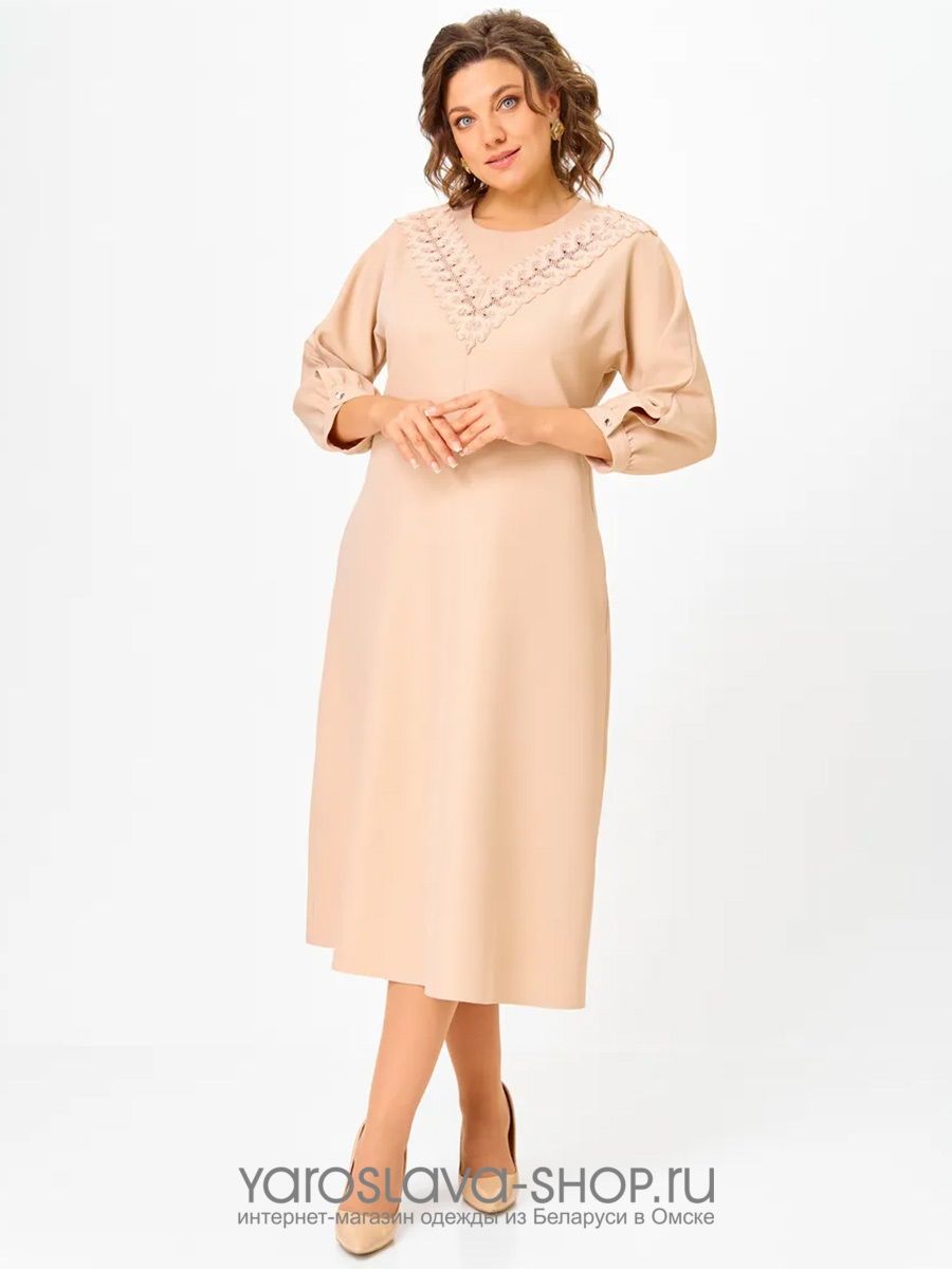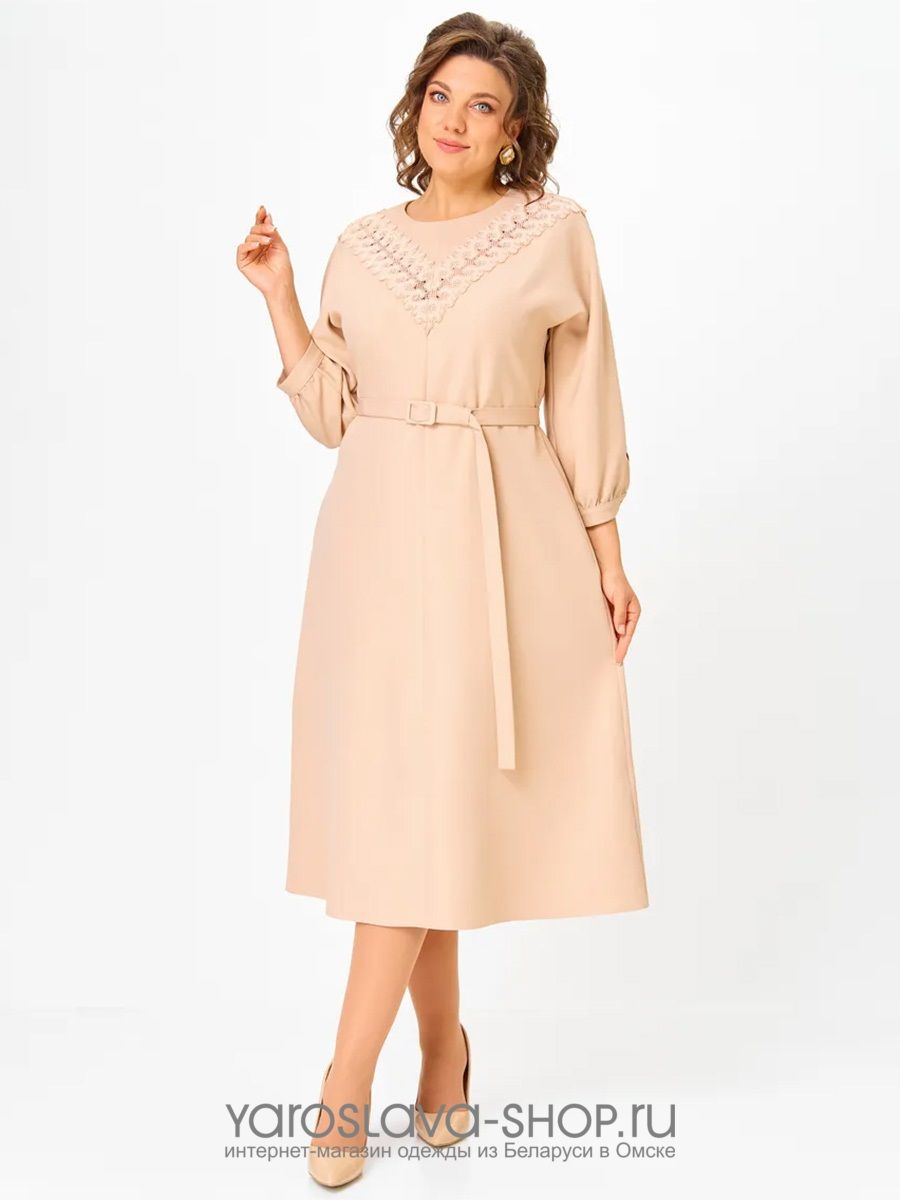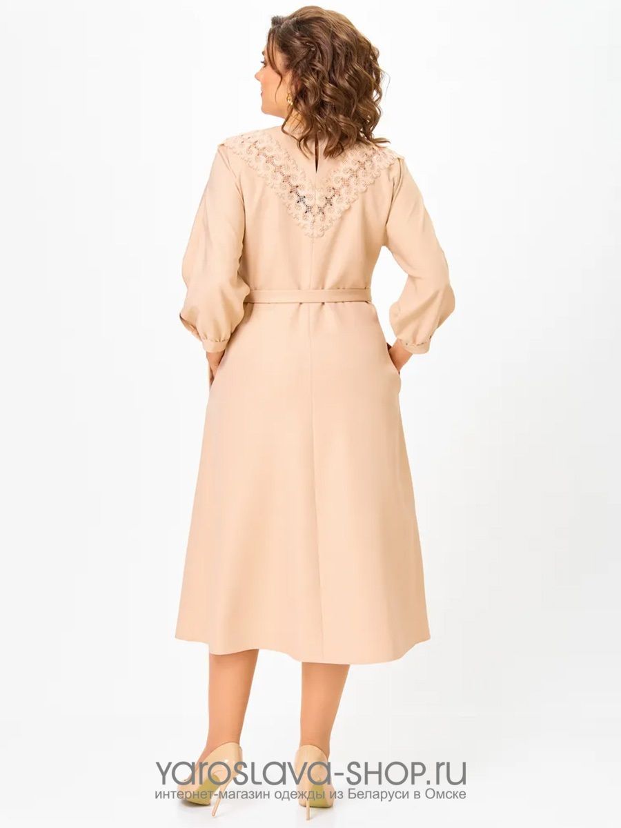 Платье женское, А-силуэта, текстильное. Платье с круглым вырезом горловины и с цельнокроенными рукавами. Перед и спинка со средним швом и отрезной фигурной кокеткой с кружевом. В среднем шве спинки капелька на застежку петля-пуговица. В боковых швах платья карманы. Рукава цельнокроеные. По низу рукавов сборка, отрезная манжета на застежку петля-пуговица и разрез в шве. Платье коплектуется съемным поясом с пряжкой и шлевкой.