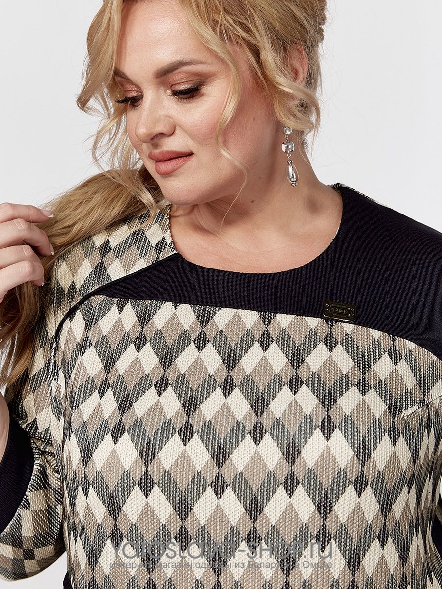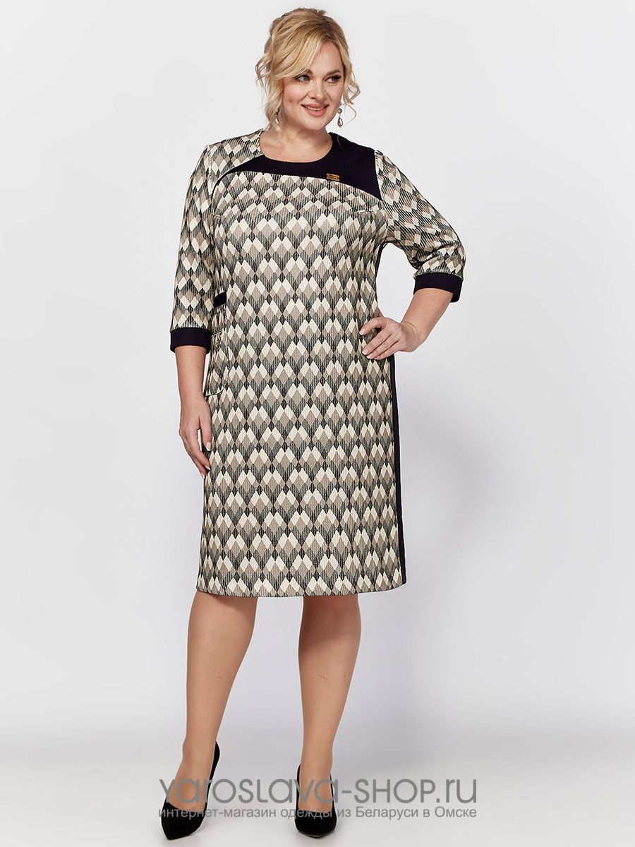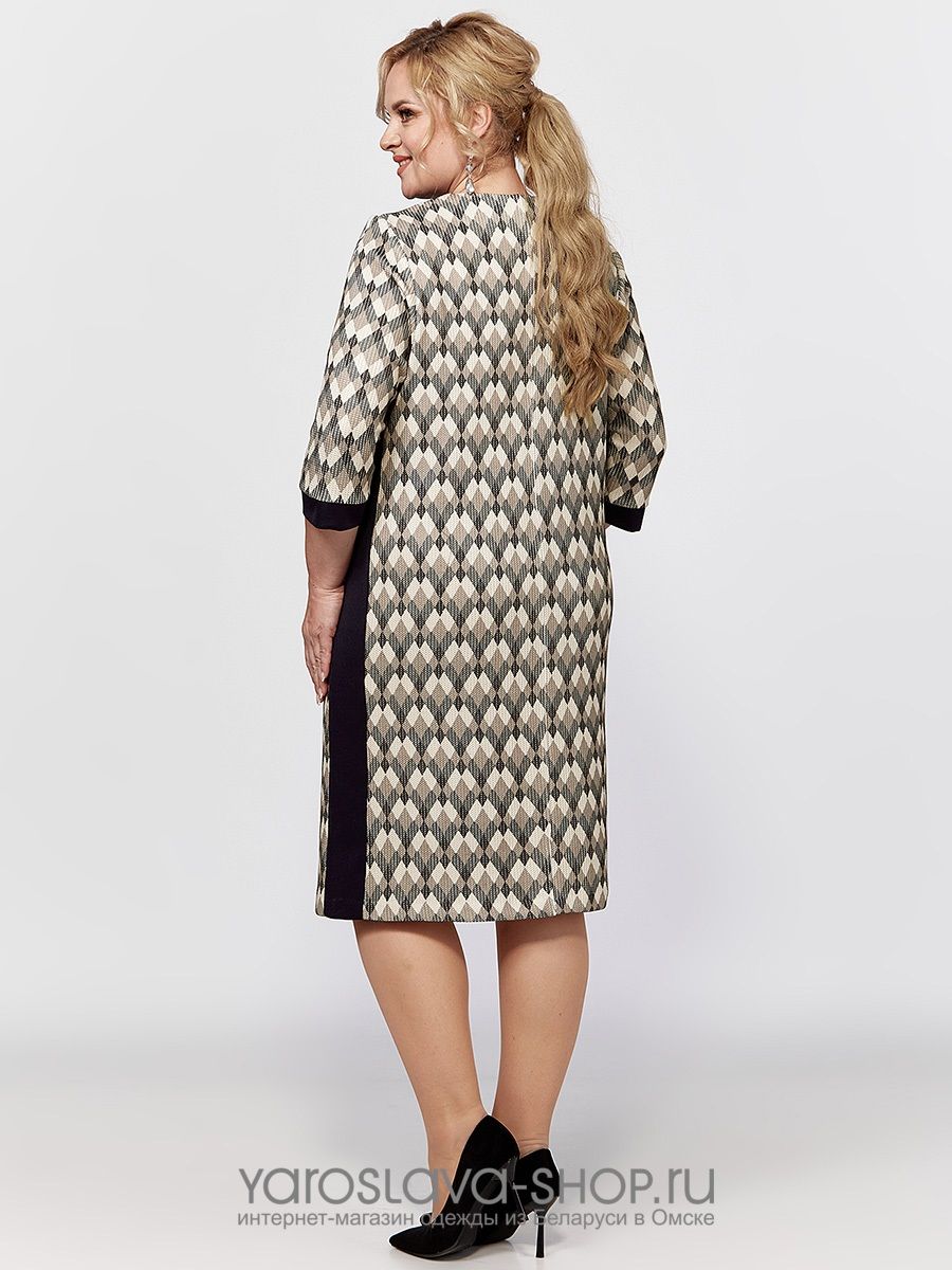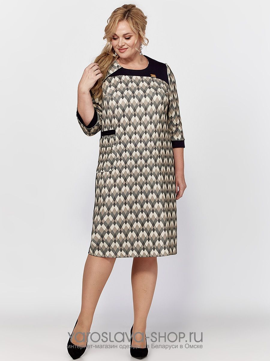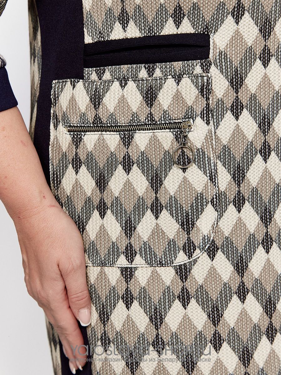 Женское платье прямого силуэта, скомбинированное из двух видов трикотажного полотна - однотонного и цветного. На полочке обработан накладной карман с молнией. Рукав длиной 7/8, втачной, одношовный, заканчивается манжетой. Спинка со средним швом. Изюминкой данной модели являются бочки, кокетка и имитация прорезного кармана из контрастной однотонной ткани.
