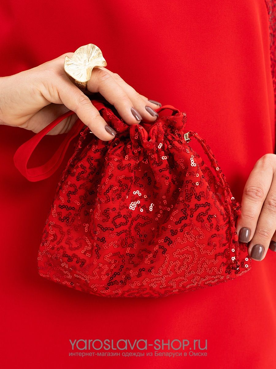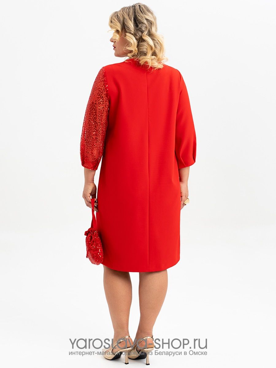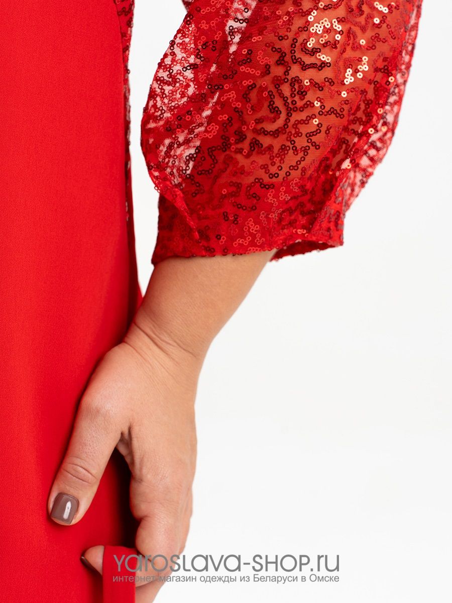 Нарядное платье больших размеров представляет собой идеальный выбор для тех, кто ищет праздничный наряд с уникальным дизайном и комфортом. Шикарное нарядное платье с ассиметричными рукавами станет красивым дополнением элегантного женственного образа. Прямой крой платья- футляр подчеркнёт Вашу фигуру, делая её ещё более привлекательной. Оно выполнена из плательной ткани и сетки расшитой пайетками. Длина изделия доходит до середины голени, приоткрывая линию ног. Благодаря такой особенности дизайна платье будет хорошо смотреться в сочетании с обувью на каблуке и на низком ходу. По переду платья есть нагрудные выточка от проймы, фигурная кокетка, небольшой разрез в боковом шве. Спинка платья со средним швом, в который вставляется молния. Вырез горловины круглый. Воздушный втачной рукав длиной 3/4, по низу которого есть складки. Подойдёт для посещения деловых мероприятий и торжественных событий. В комплекте к платью прилагается нарядная сумочка .Эта маленькая сумочка придаёт завершённость образу. Выполненная в блестящем дизайне, она привлекает внимание и добавляет нотку роскоши. Наступает год Огненной Лошади и платье прямого кроя с сумочкой красного цвета принесет Вам удачу в следующем году!