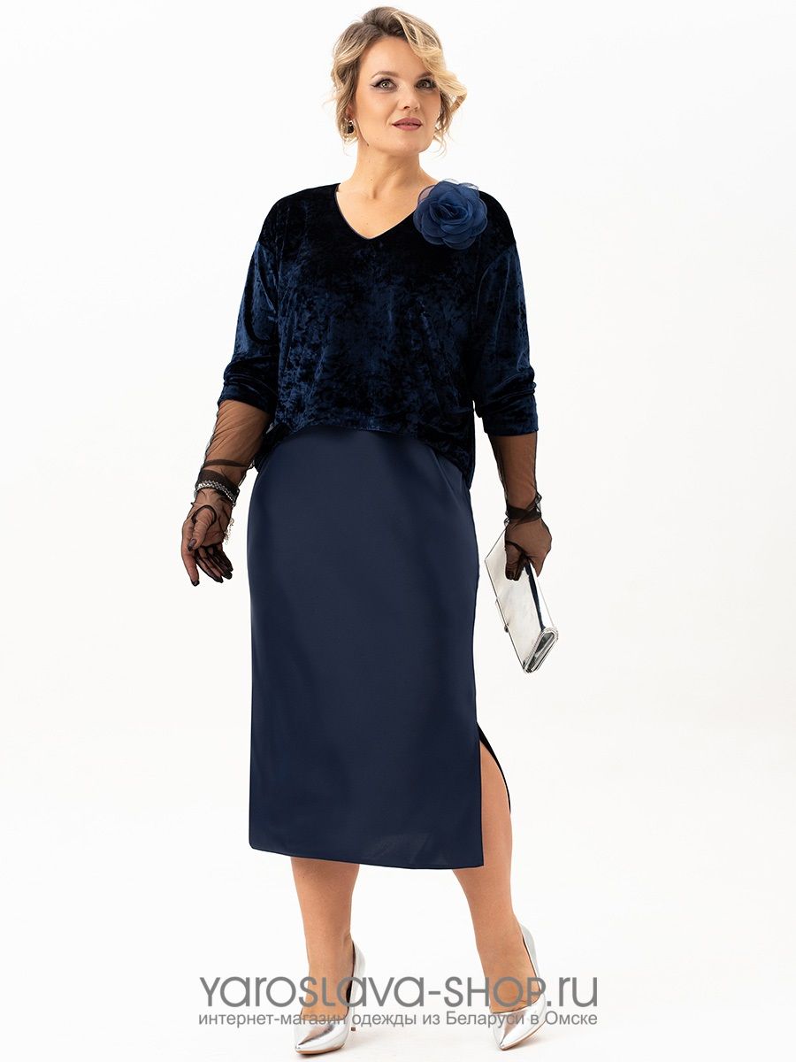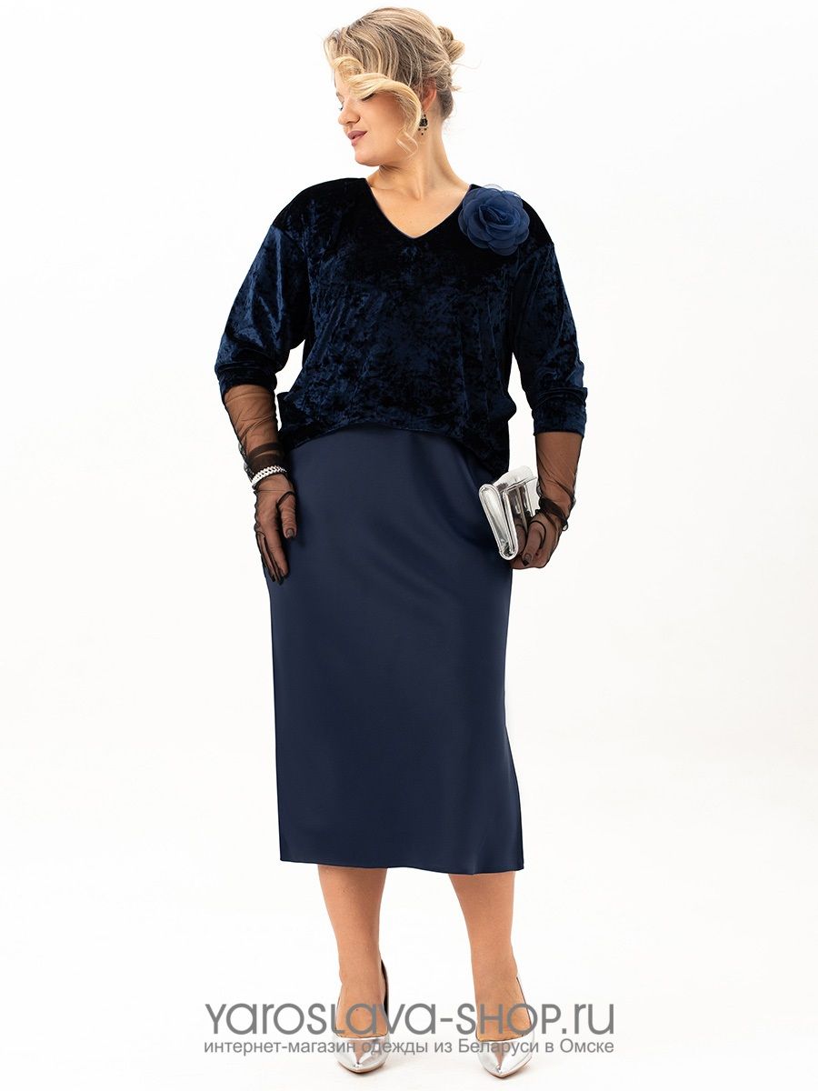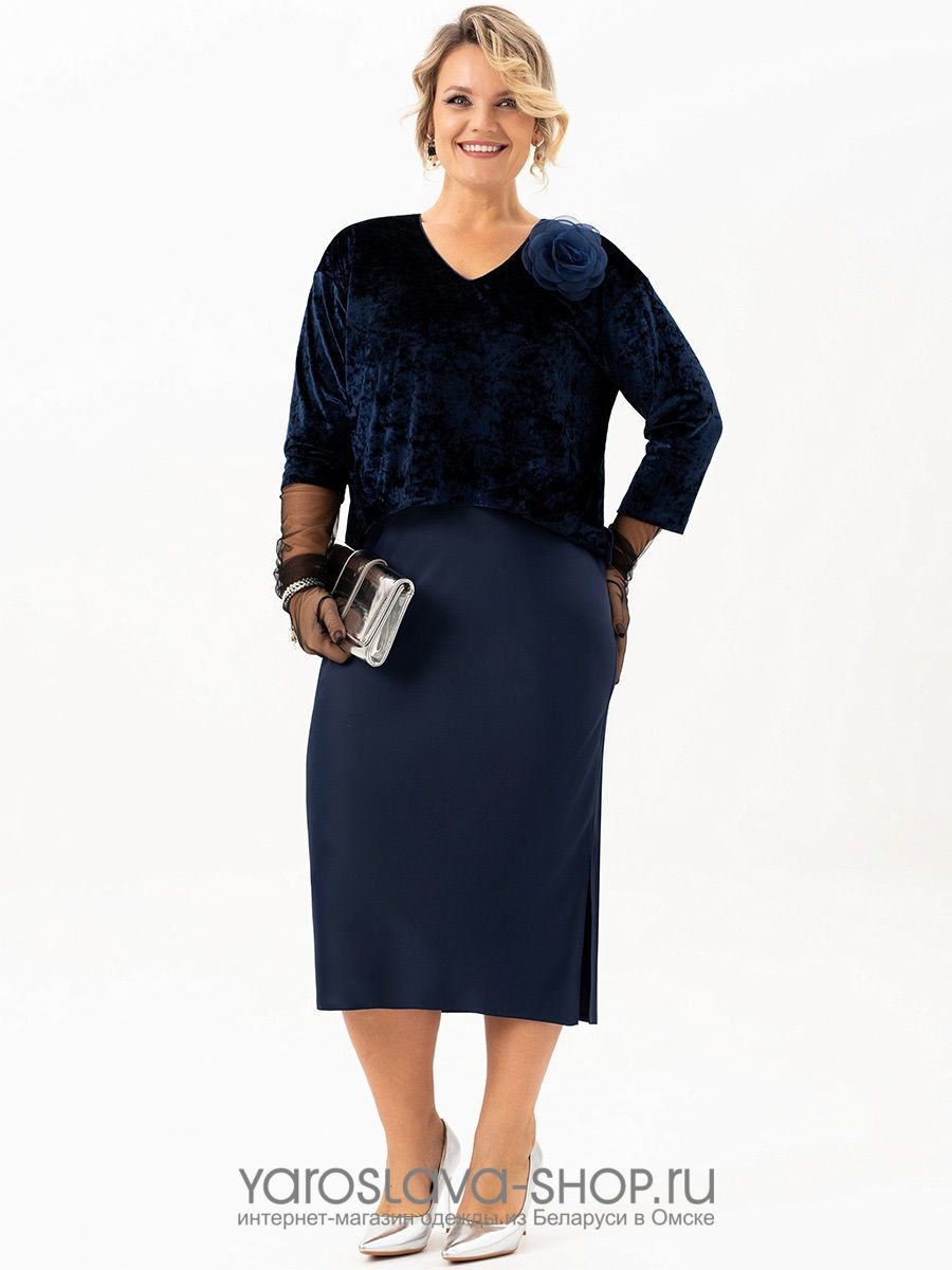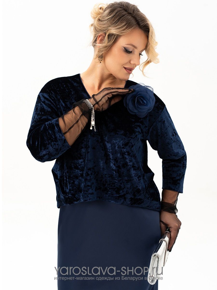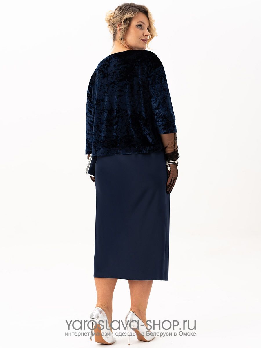 Эффектное бархатное платье-имитация костюма в синем цвете
