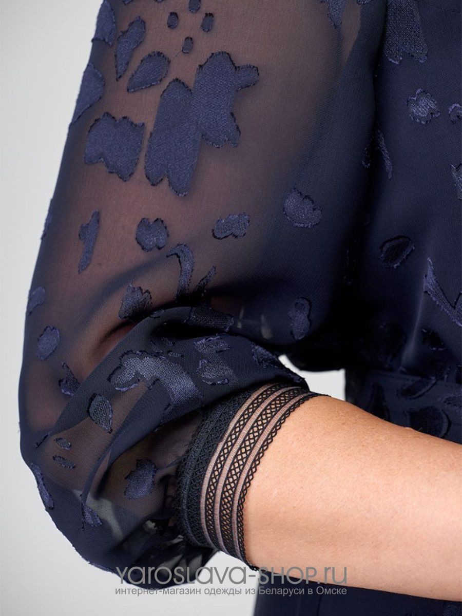 Элегантное платье на трикотажной подкладке из принтованной шифоновой ткани, А- силуэта, стройнит фигуру. Вырез горловины круглой формы. По переду нагрудные вытачки направлены от линии проймы к центру груди. Спинка со средним швом и каплевидной застежкой на пуговице. Рукав втачной, низ рукава собран на эластичную тесьму. Платье комплектуется с тканевым поясом.