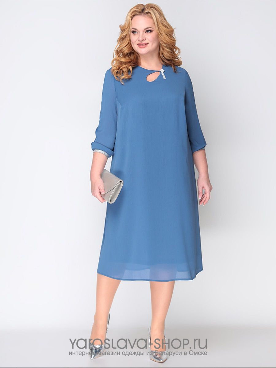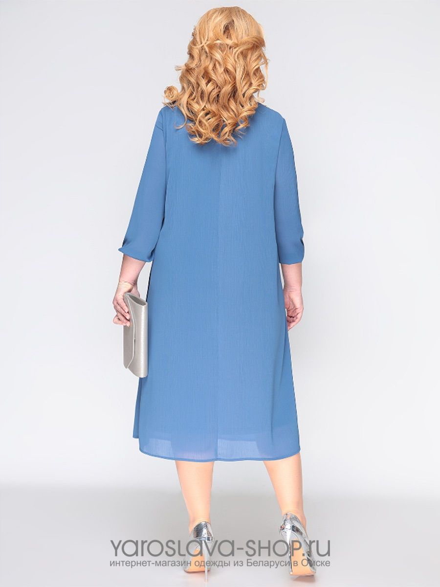 Однотонное платье А-силуэта на подкладке из жатого шифона. По переду платья есть нагрудные вытачки. Вырез горловины ассиметричный в виде капли с брошью. Рукав втачной внизу собран на декоративную эластичную тесьму под серебро.