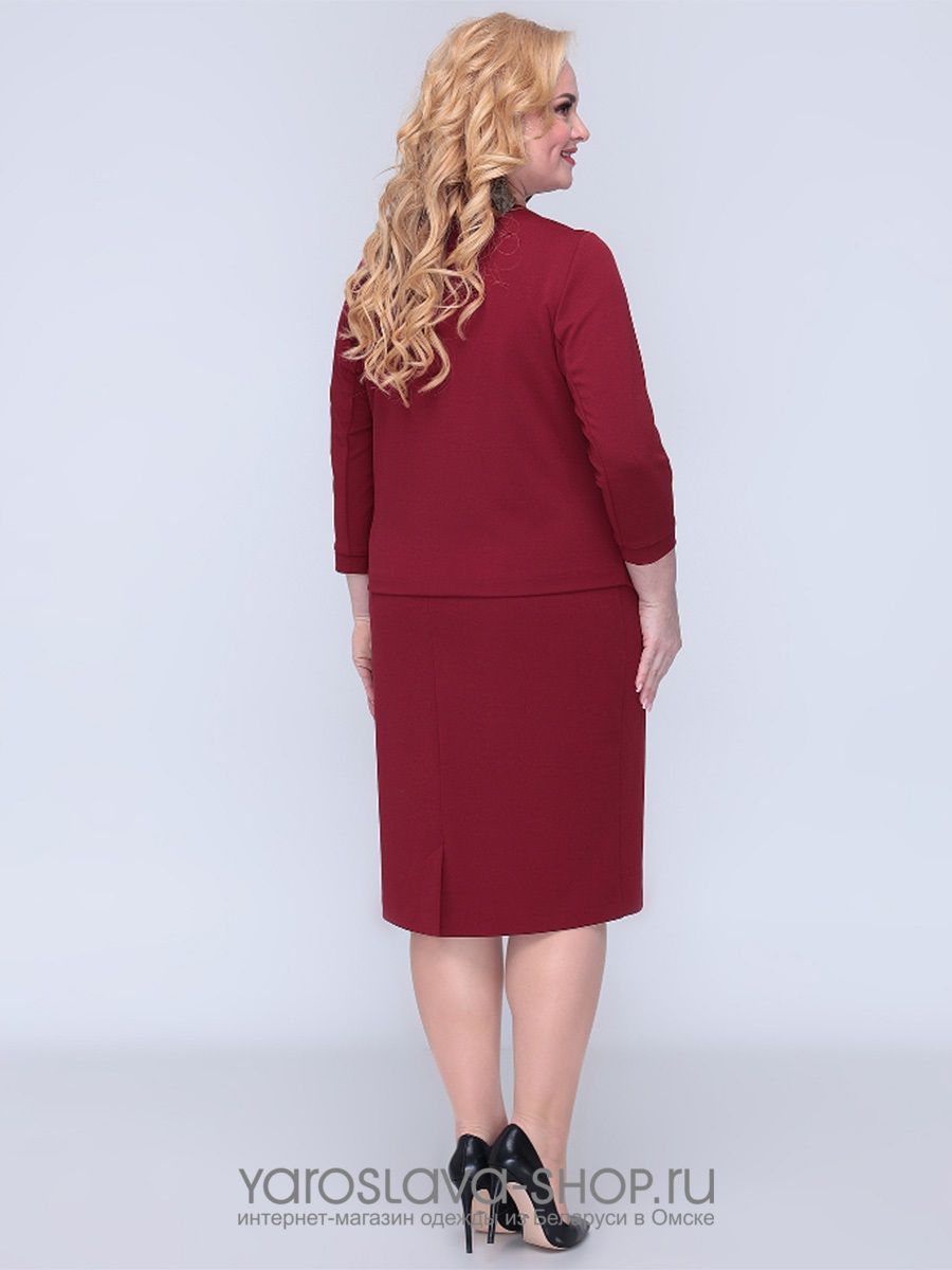 Платье прямое приталенное бордового цвета смотрится как костюм