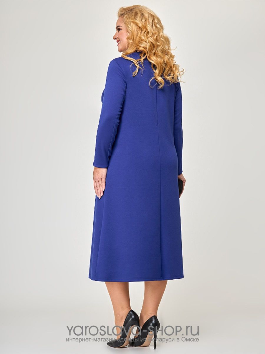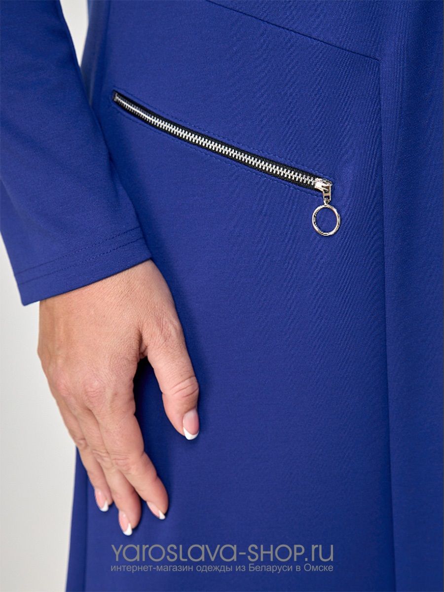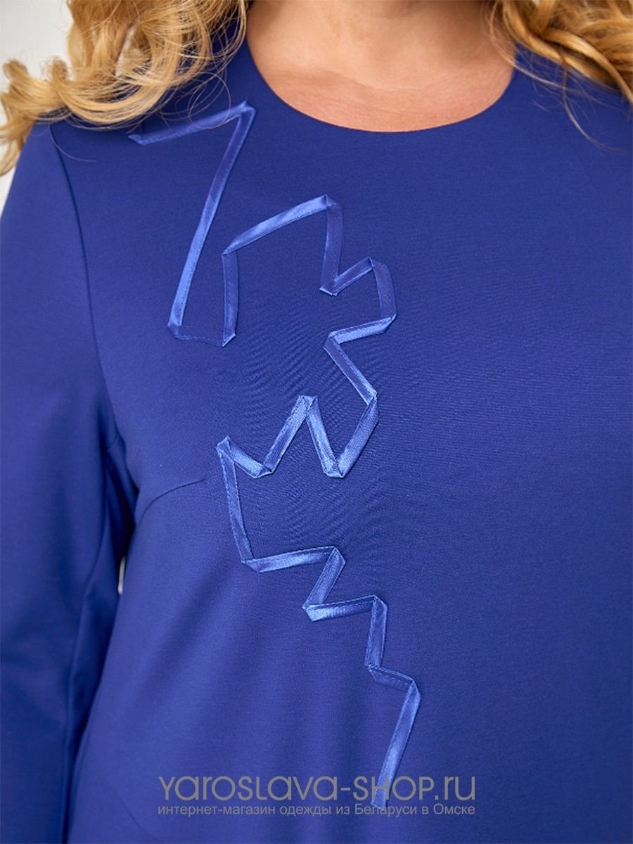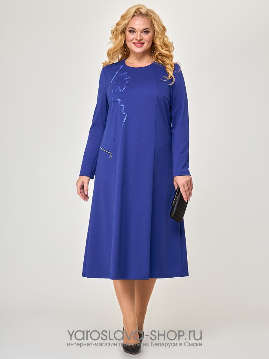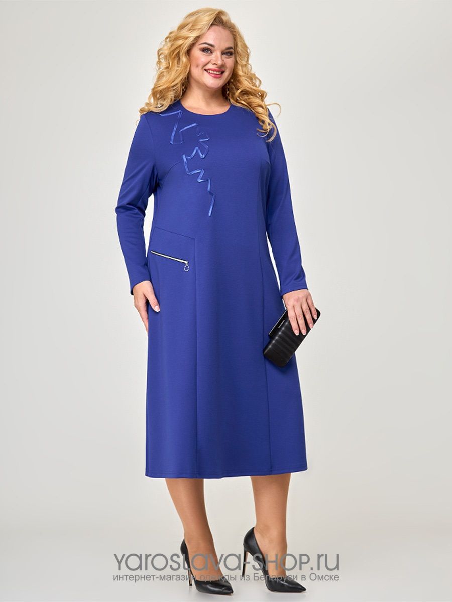 Стильное платье, для торжеств и повседневной носки, А-силуэта, из трикотажного полотна, длины миди. Вырез горловины круглый, рукав втачной, длинный. Передняя полочка дополнена аппликацией из атласной ленты, справа обработана молния -имитация кармана. Спинка со средним швом.