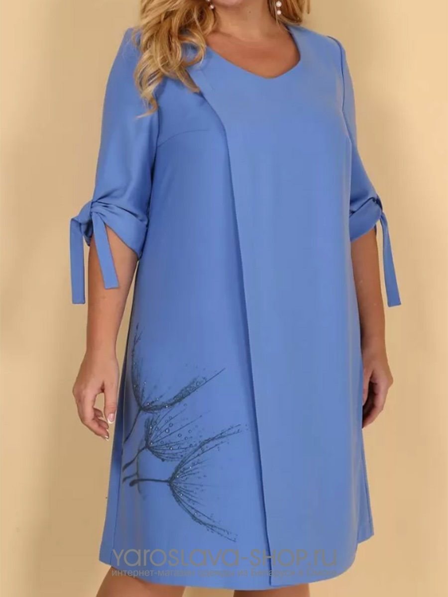 Нарядное платье А-силуэта, выполнено из стрейчевой плательно-костюмной ткани. По переду имеются нагрудные вытачки и отлетная верхняя деталь. Вырез горловины V-образной формы. По спинке средний шов и застёжка с петелькой. Рукав втачной, по низу с манжетой и завязывающейся патой. В качествен отделки платье дополнено дизайнерским принтом и металлической фурнитурой.