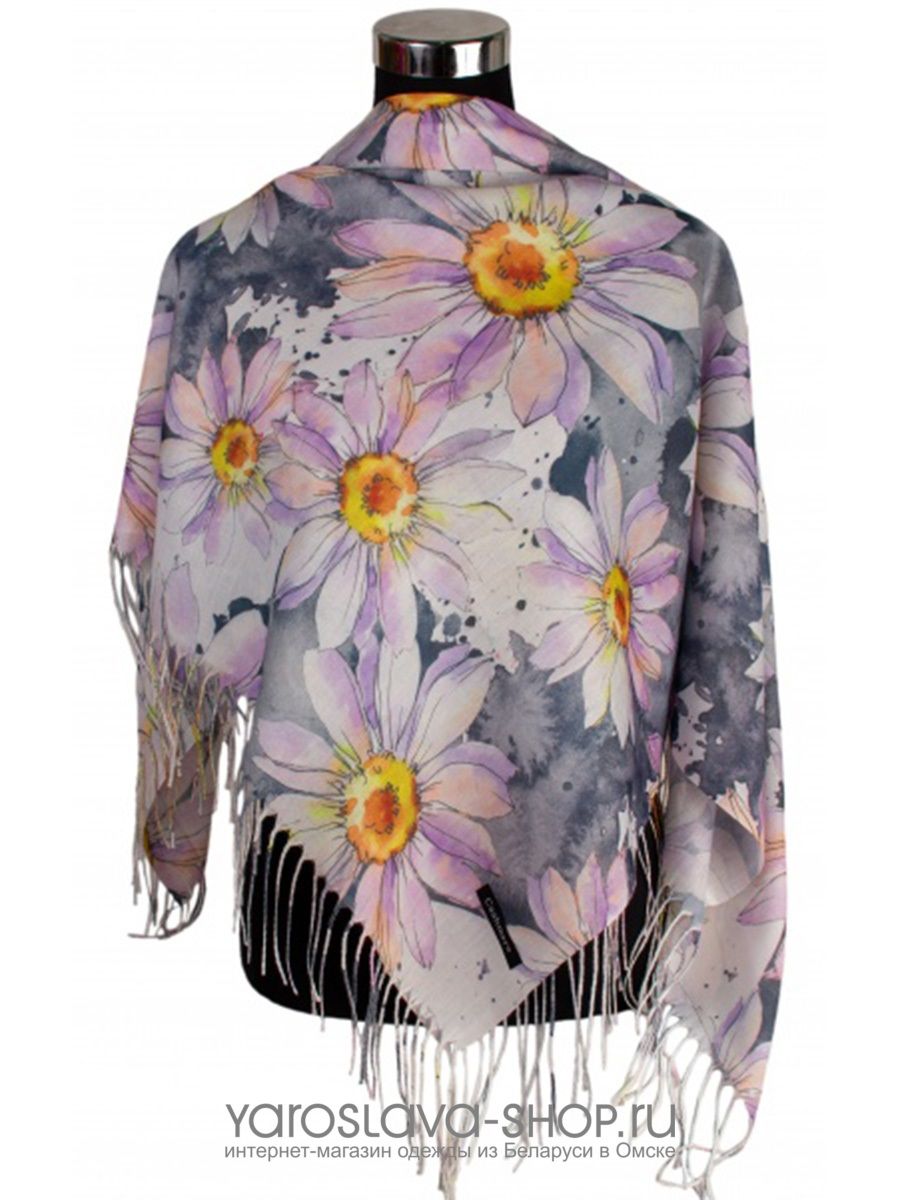 Серый платок из вискозы с розовыми ромашками