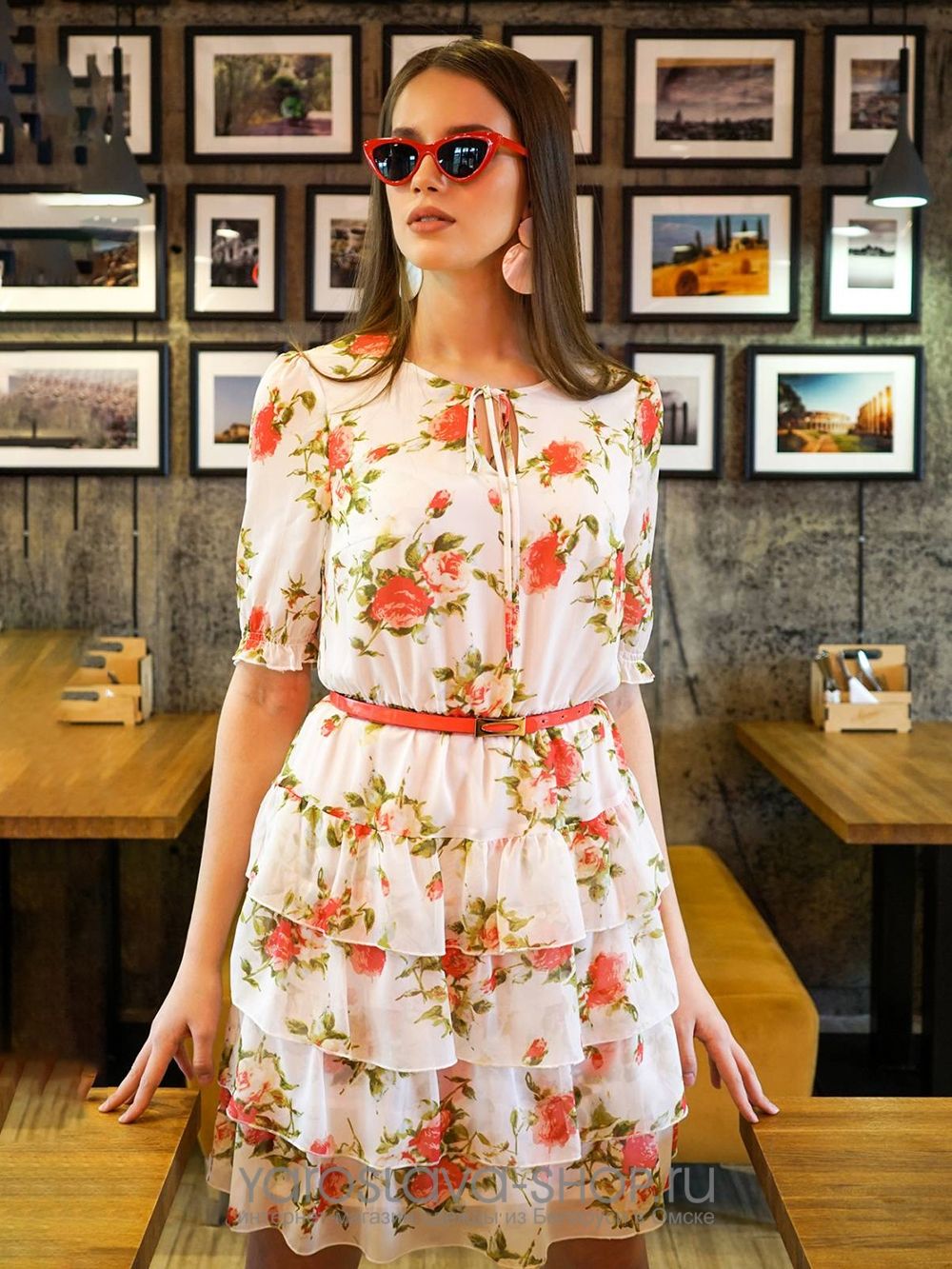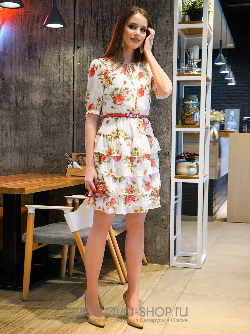 Платье из из шифона белого цвета с цветочным рисунком. По низу множественные воланы. Вырез горловины круглый с капелькой на завязках. Рукава до локтя, присборены по окату. В комплекте яркий узкий ремень. Платье на подкладке.