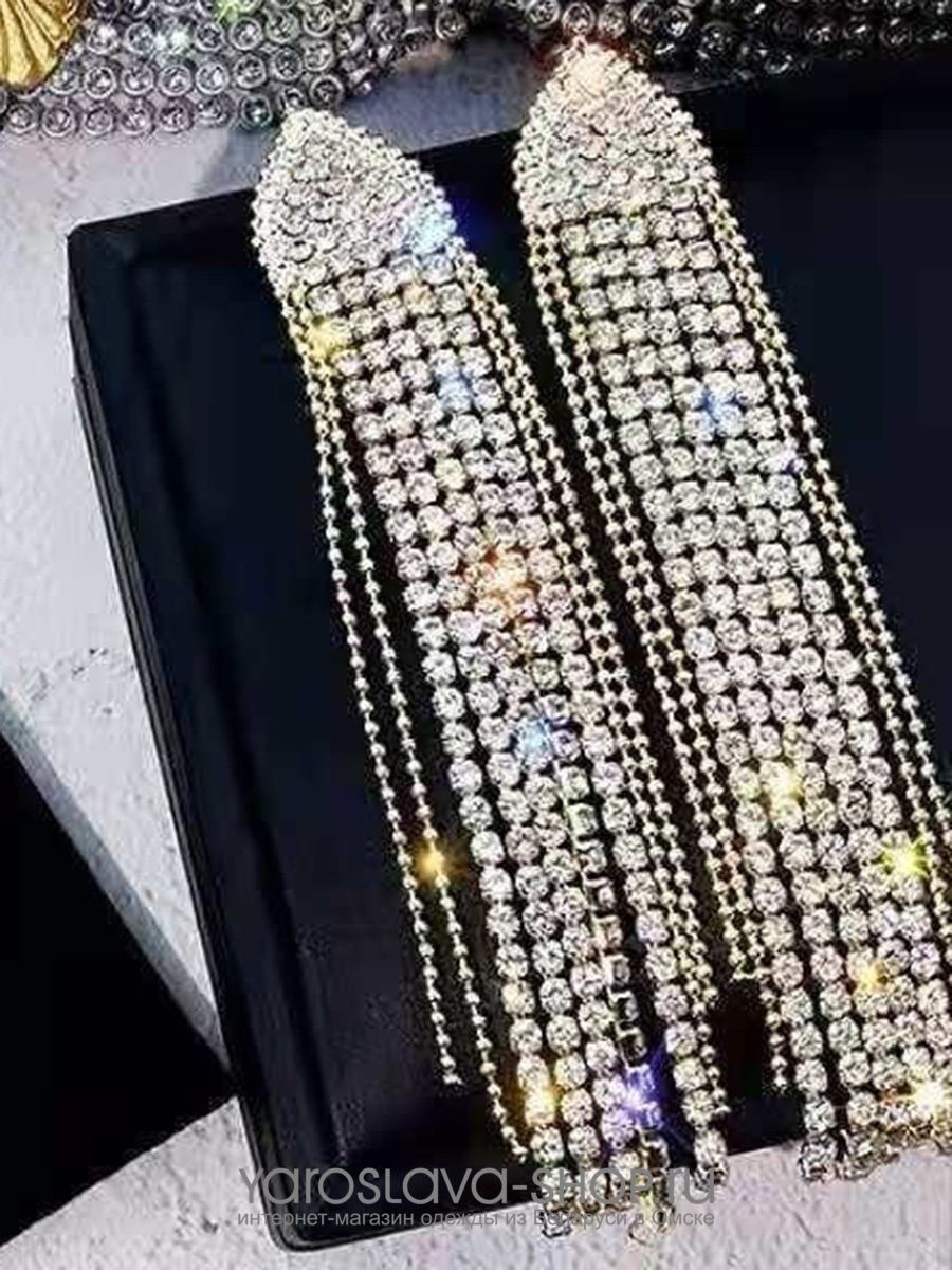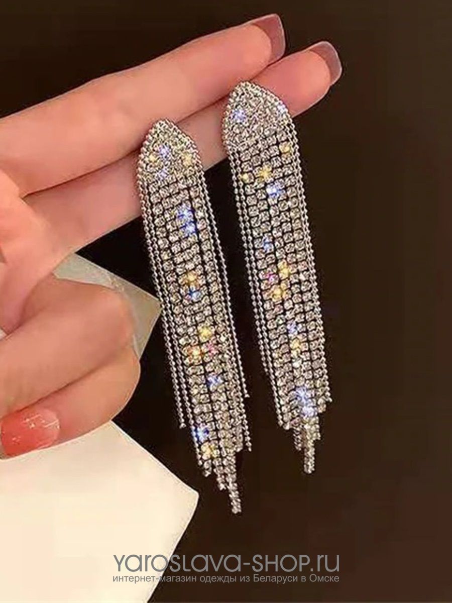 Длинные серьги пусеты из белого металла, с подвесками из страз.
