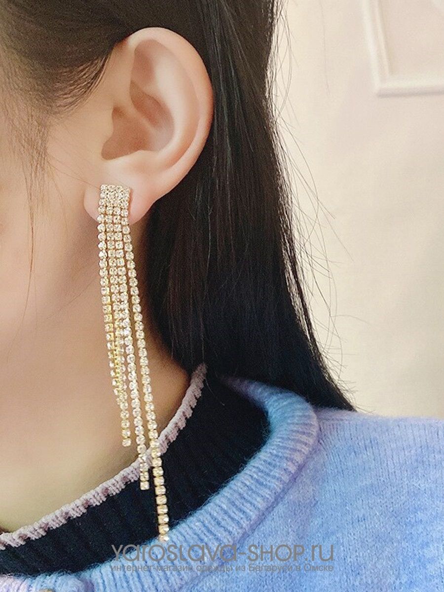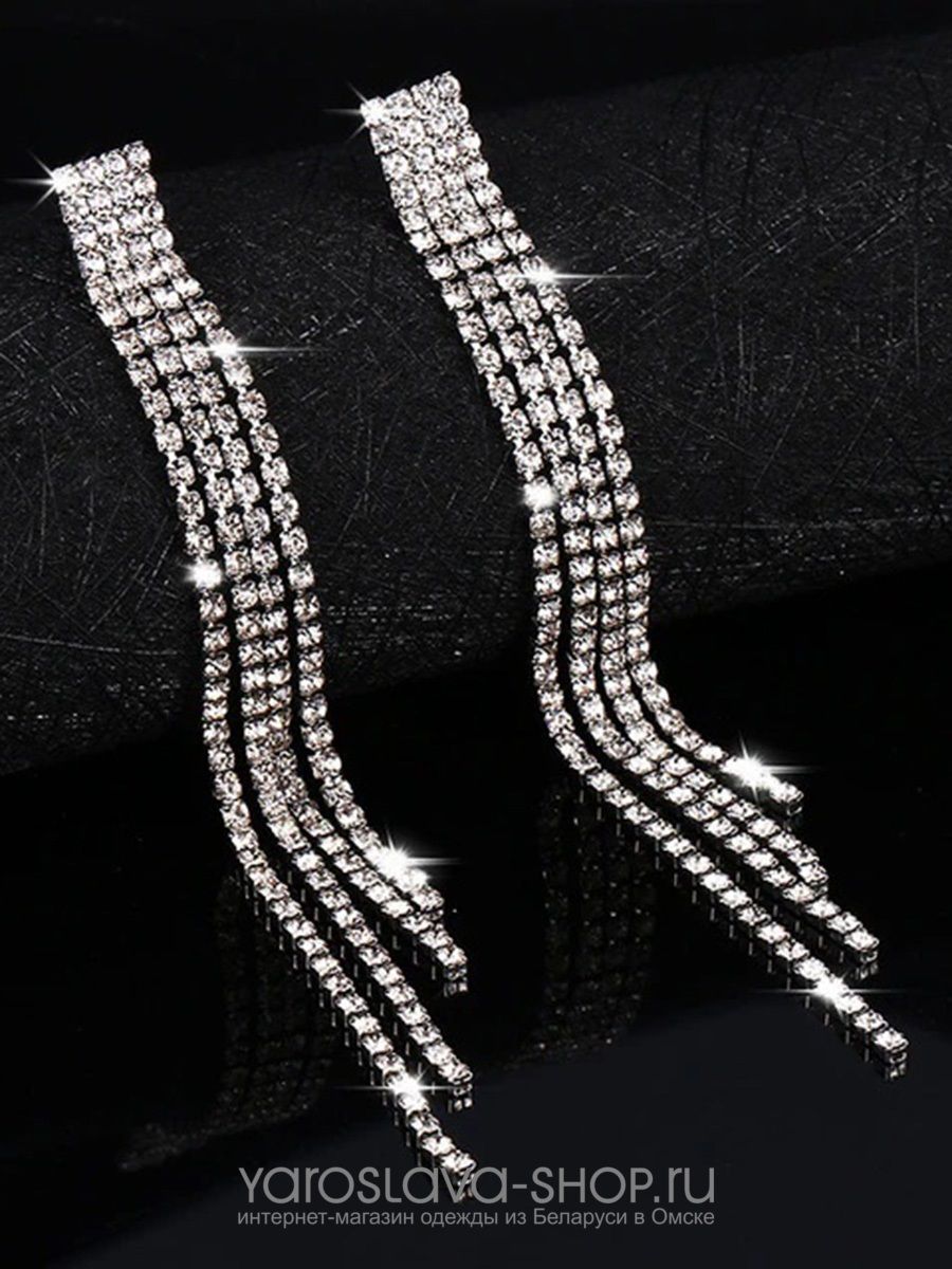 Длинные серьги пусеты из белого металла, с подвесками из страз.