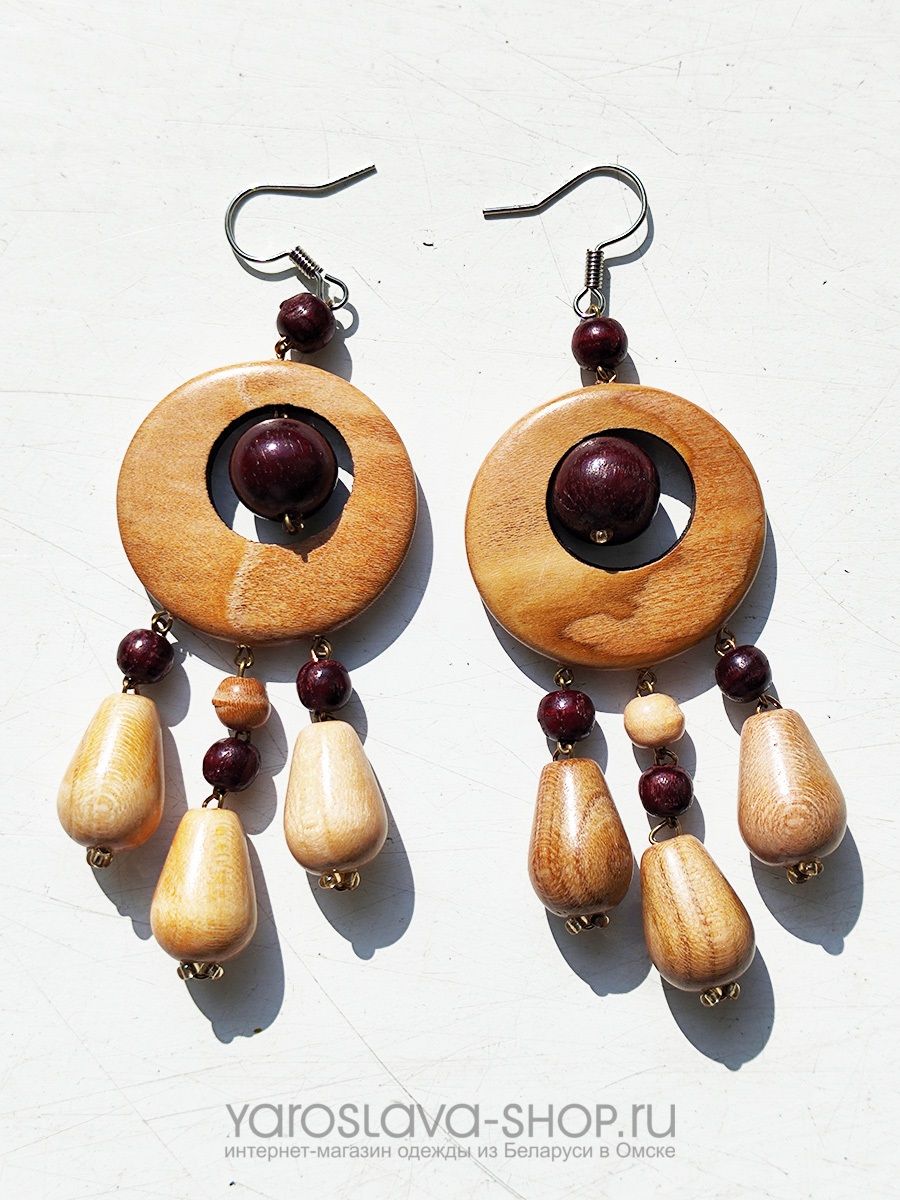 Серьги выполнены из натурального дерева разных пород. Застежка мелаллическая ввиде крючка.
