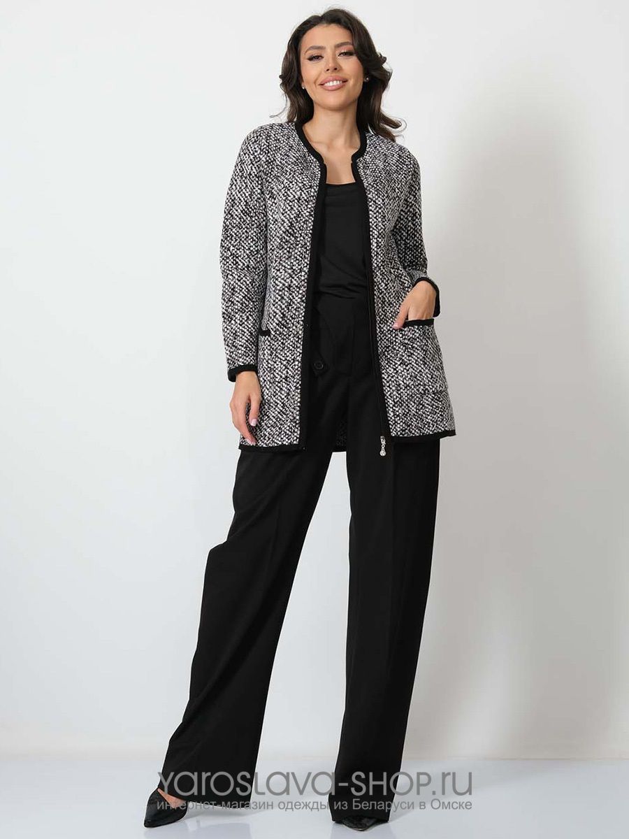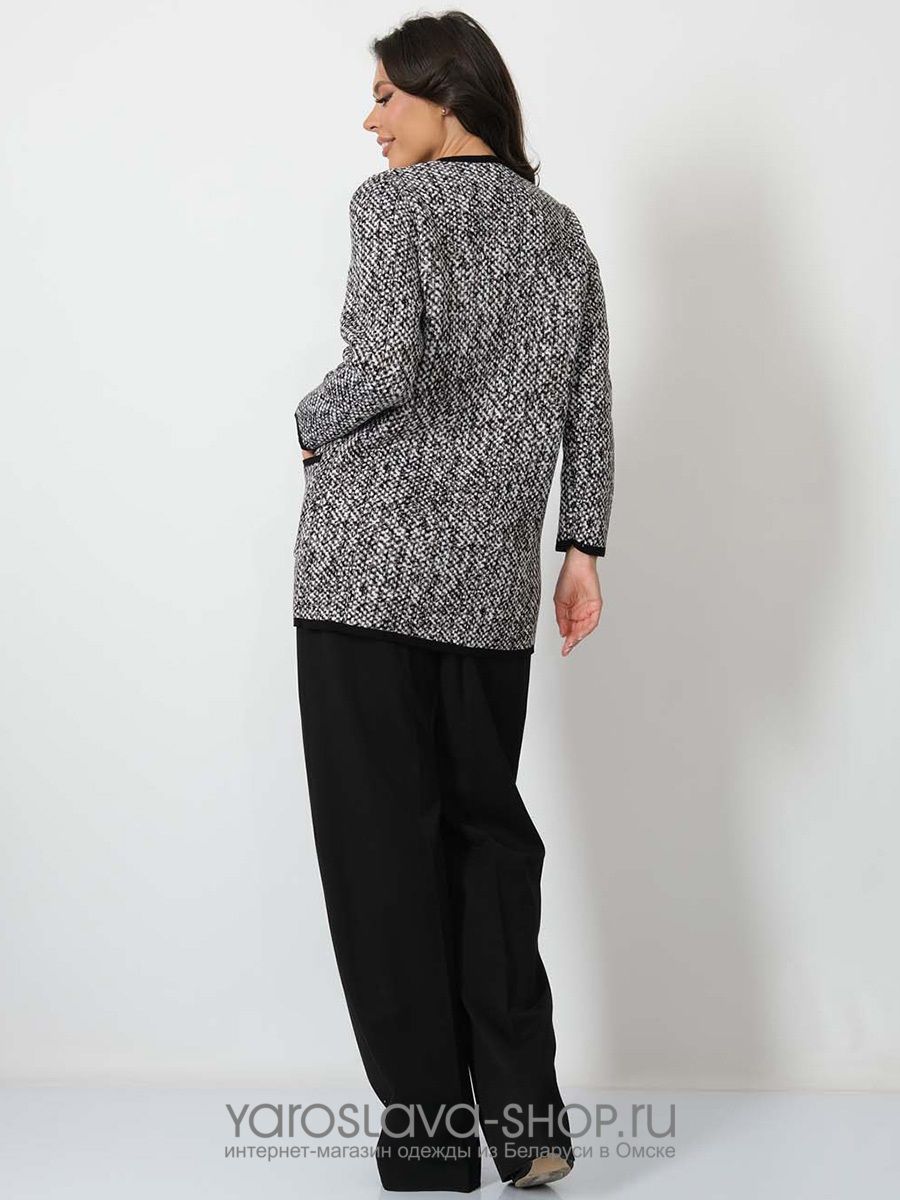 Женский вязаный жакет полуприлегающего силуэта с круглой горловиной без воротника. Модель удлиненная - длина составляет 75 см. Жакет застегивается на молнию по всей длине, края бортов обработаны контрастной бейкой. В модели выполнены функциональные карманы, края которых также обработаны бейкой. Жакет изготовлен из высококачественной пряжи. Рукава втачные, длинные. Жакет выполнен жаккардовым переплетением нитей 3-оттенков. Модель отлично дополнит Ваш деловой образ и подойдет для повседневной носки. В сочетании с классическими брюками или юбкой любой длины Вы будете выглядеть строго и официально. В сочетании с джинсами, в этом жакете можно пойти на вечеринку или на прогулку с друзьями.